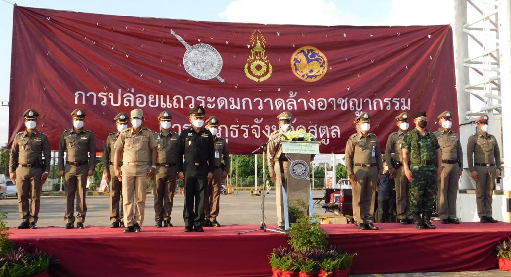 วันนี้ 25 ธ.ค.2564 ที่บริเวณลานหน้าห้างแมคโคร สาขาสตูล นายเอกรัฐ หลีเส็น ผู้ว่าราชการจังหวัดสตูล เป็นประธานปล่อยแถวระดมกวาดล้างอาชญากรรมห้วงวันหยุดยาวปีใหม่ 2565 พร้อมกล่าวว่า การปล่อยแถวฯ ในครั้งนี้ เพื่อให้ประชาชนในพื้นที่และนักท่องเที่ยวมีความปลอดภัยในชีวิตและทรัพย์สิน และเป็นการอำนวยความสะดวกแก่ประชาชนด้านการจราจรในช่วงเทศกาลปีใหม่ 2565 ให้เป็นไปอย่างมีประสิทธิภาพ และสามารถควบคุมปัญหาอาชญากรรมให้อยู่ในระดับที่ไม่ก่อให้เกิดความหวาดกลัวต่อพี่น้องประชาชน สำนักงานตำรวจแห่งชาติจึงกำหนดแผนกวาดล้างอาชญากรรมในครั้งนี้ขึ้น