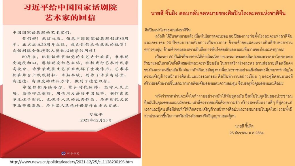 นายสี จิ้นผิง (习近平) ตอบกลับจดหมายศิลปินโรงละครแห่งชาติจีน (给中国国家话剧院艺术家的回信) เมื่อวันที่ ๒๕ ธ.ค.๖๔ ซึ่งในสารดังกล่าวมีประเด็นที่น่าสนใจดังนี้