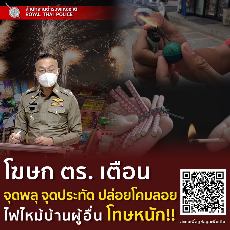 วันที่ 2 ม.ค.65 พล.ต.ต.ยิ่งยศ เทพจำนงค์ โฆษกสำนักงานตำรวจแห่งชาติ เผยว่า ช่วงเทศกาลปีใหม่นี้ พี่น้องประชาชนอาจจะมีการเฉลิมเฉลอง จุดพลุ จุดประทัด ปล่อยโคมลอย ซึ่งการปล่อยโคมลอย อาจเป็นอุปสรรค หรือเป็นการรบกวนในการทำการบิน หรือไปตกที่บ้านของผู้อื่น เป็นเหตุให้เกิดเพลิงไหม้ เกิดความสูญเสียชีวิตและทรัพย์สิน