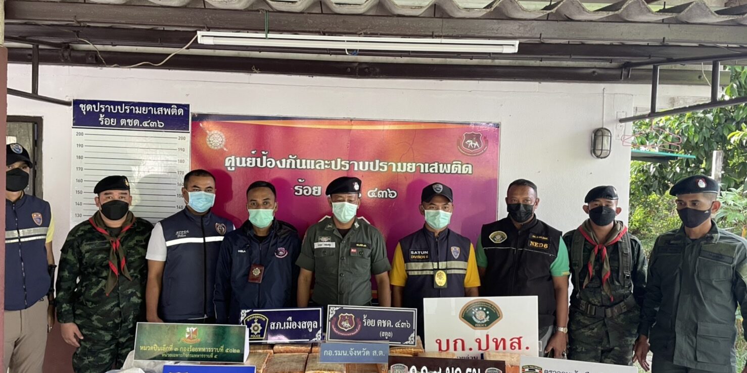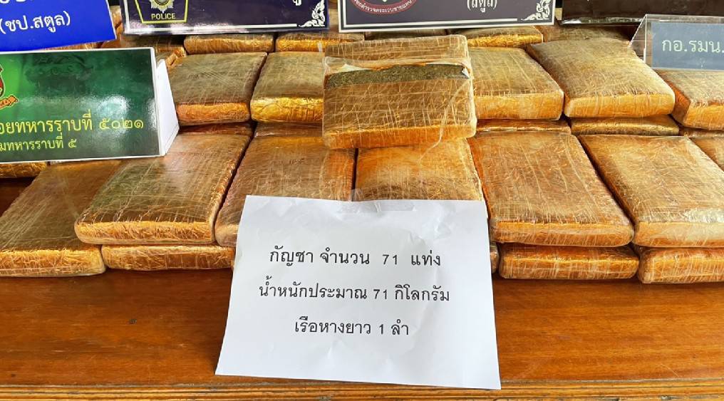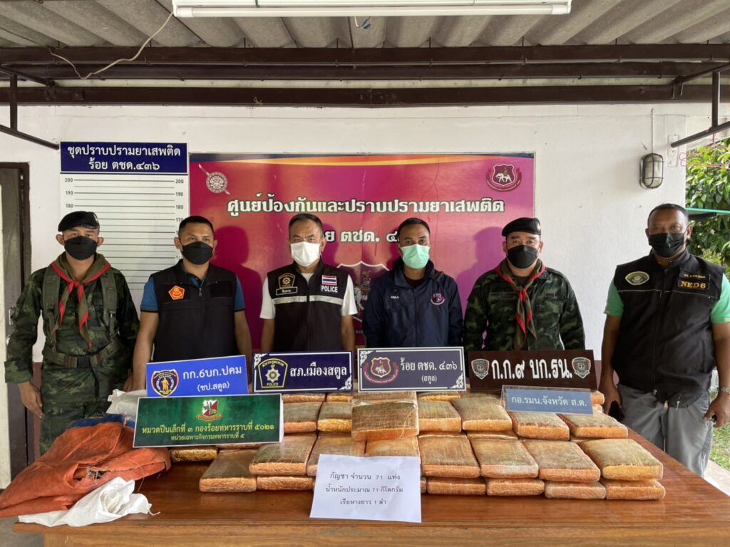 วันที่ 3 มกราคม 2565 เมื่อวันที่ 2มกราคม 2565 ที่ผ่านมาเจ้าหน้าที่ ตชด.ยังคงทำงานกันอย่างหนักในช่วงเทศกาลปีใหม่ 2565 โดยเฉพาะตามแนวตะเข็บชายแดนไทยมาเลเซีย ทางทะเลริมชายฝั่ง ได้มีการออกลาดตระเวนตามแนวชายฝั่ง เฝ้าระวัง การลักลอบทำผิดกฎหมาย ล่าสุดพล.ต.ต.อรรถวุฒิ อ่อนทรัพย์ ผบก.ตชด.ภาค 4 ,พ.ต.อ.ยงศักดิ์ รัตนดิลก ณ ภูเก็ต ผกก.ตชด.43,พ.ต.ท.ธีรศักดิ์ ศรีราชยา ผบ.ร้อย ตชด.436, ร.ต.อ.พรเทพ หมื่นแกล้ว รองผบ.ร้อย ตชด.436,ร.ต.อ.ปริวรรต หมาดรา หน.ชปข. ร้อย ตชด.436 นำกำลังเจ้าหน้าที่ ตชด.436 ,ชฝต.4301 พร้อมเจ้าหน้าที่ตำรวจน้ำสตูล,ตำรวจ ตม.สตูล,ทหาร,ได้ออกลาดตระเวนทางน้ำริมชายฝั่งตั้งแต่ท่าเทียบเรือตํามะลังถึงหลักเขตแดนที่ 1 คลองกุ้งเมื่อเวลาประมาณ 10.00 น.ระหว่างเรือออกลาดตระเวนตรวจพบเรือที่จอดอยู่บริเวณใกล้ป่าโกงกาง บ้านหัวแหลมหมู่ที่ 3 ตำบลปูยู อำเภอเมือง จังหวัดสตูลจากนั้นเจ้าหน้าที่จึงทำการตรวจสอบเรือที่ผูกอยู่กับต้นไม้ปรากฏว่าไม่มีผู้ควบคุมเรือจากนั้นจึงได้ตรวจสอบภายในเรือพบกระสอบสีขาวจำนวน 4 กระสอบห่อหุ้มด้วยถุงพลาสติกสีดำอีกชั้นหนึ่งห่อด้วยผ้ายางสีส้มภายในลำเรือดังกล่าวจากนั้นเจ้าหน้าที่จึงทำการเปิดกระสอบปุ๋ยต้องสงสัยออกดูปรากฏว่าบรรจุวัสดุเป็นแท่งห่อหุ้มด้วยกระดาษฝอยสีทองห่อหุ้มด้วยพลาสติกใสอีกชั้นหนึ่ง เจ้าหน้าที่จึงตรวจสอบภายในพบว่าเป็นยาเสพติดให้โทษประเภท 5 (กัญชา ) จำนวน 71 แท่ง/กิโลกรัม ที่เกิดเหตุไม่พบผู้ใดแสดงตนเป็นเจ้าของ คาดว่าจะไหวตัวและหลบหนีไปได้ มูลค่าของกลาง 852,000 บาท