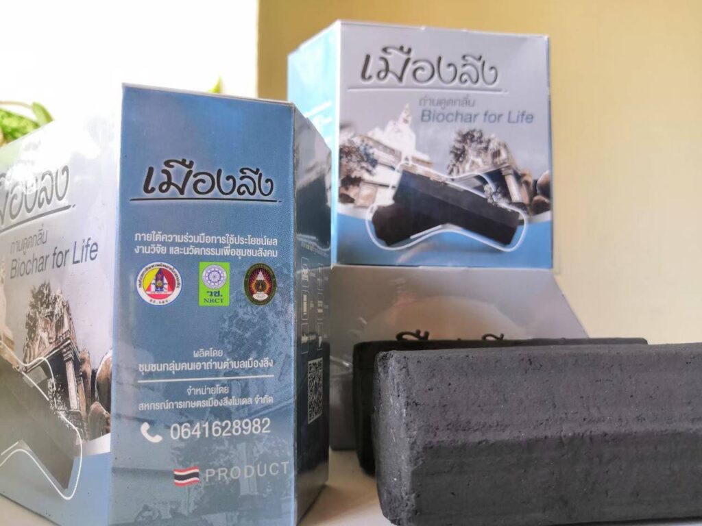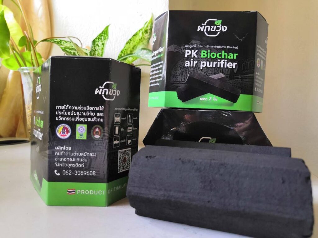 ถ่านดูดกลิ่น 3 In 1 มีคุณสมบัติในการดูดซับกลิ่น ความชื้น และจุลินทรีย์หรือเชื้อโรคในอากาศได้เป็นอย่างดี นอกจากนี้ถ่านมีประจุลบ และอินฟาเรดยาว ทำให้มีคุณประโยชน์ต่อสุขภาพ ช่วยกระตุ้นการไหลเวียนของเลือด สามารถวางไว้ในห้องนอน หรือใช้ได้ทั้งครัวเรือน เนื่องจากไม่มีสารเคมีเจือปน เป็นมิตรกับสิ่งแวดล้อม วัตถุดิบที่ใช้ในการผลิตเป็นวัสดุอินทรีย์ 100 เปอร์เซ็นต์ ภายใต้แบรนด์ถ่านดูดกลิ่น “Biochar for Life” ผลิตโดย ชุมชนกลุ่มคนเอาถ่านตำบลเมืองลีง อำเภอจอมพระ จังหวัดสุรินทร์ และ“PK Biochar air purifier”ผลิตและจำหน่ายโดยกลุ่มคนทำถ่านตำบลผักขวง อำเภอทองแสนขัน จังหวัดอุตรดิตถ์ โดยมีผลการตรวจวิเคราะห์ผ่านเกณฑ์มาตรฐานผลิตภัณฑ์ชุมชน (มผช.) ถ่านดูดกลิ่น มผช.180/2563 นับว่า เป็นการเพิ่มมูลค่าเศษวัสดุเหลือใช้ให้เกิดประโยชน์ได้อย่างแท้จริง