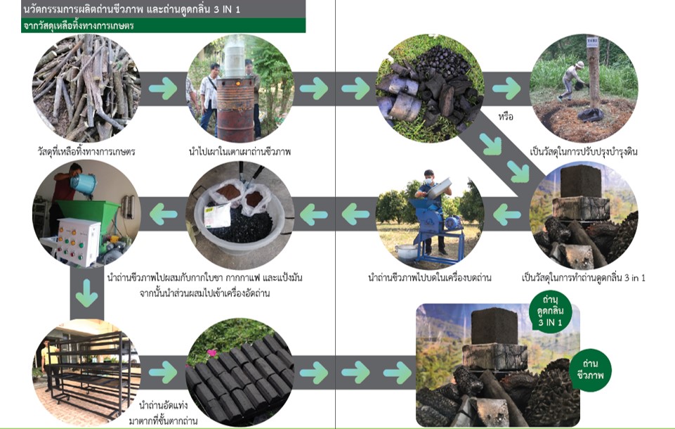 จากปัญหาเศษวัสดุเหลือทิ้งทางการเกษตร อาทิ เปลือกทุเรียน เหง้ามันสำปะหลัง แกนข้าวโพด ข้อไม้ไผ่ รวมถึงเศษกิ่งไม้ริมทาง ยังไม่ได้ถูกนำมาใช้ให้เกิดประโยชน์มากนัก อีกทั้งการจัดการโดยเผาเศษวัสดุเหลือทิ้งในที่โล่ง ยังเป็นการปล่อยก๊าซเรือนกระจกและมลสารเข้าสู่ชั้นบรรยากาศ องค์ความรู้และนวัตกรรมการผลิตถ่านดูดกลิ่น 3 In 1 ด้วยวิธีไพโรไลซิส จึงนับเป็นแนวทางหนึ่งในการแก้ไขประเด็นปัญหาดังกล่าวได้ ขณะนี้นักวิจัยได้ถ่ายทอดองค์ความรู้และติดตั้งนวัตกรรมแล้ว ประกอบด้วย เตาผลิตถ่านดูดกลิ่นแบบไพโรไลซิส เครื่องบดถ่าน ชั้นตากถ่าน เครื่องอัดถ่าน เครื่องเจียรตัดแต่งถ่าน และเครื่องเป่าลมร้อน พร้อมการออกแบบ เพื่อส่งเสริมให้เกิดผลิตภัณฑ์และเกษตรกรต้นแบบ กว่า 100 ราย ใน 2 จังหวัดเป้าหมาย คือ กลุ่มคนทำถ่าน จ.อุตรดิตถ์ และกลุ่มคนเอาถ่าน จ.สุรินทร์ โดยได้รับการสนับสนุนทุนวิจัยจากสำนักงานการวิจัยแห่งชาติ (วช.) บูรณาการการทำงานร่วมกับกองอำนวยการรักษาความมั่นคงภายในราชอาณาจักร (กอ.รมน.)