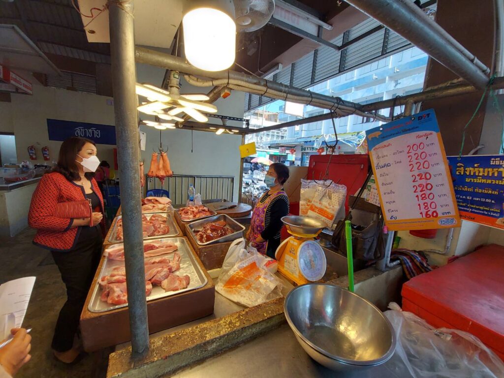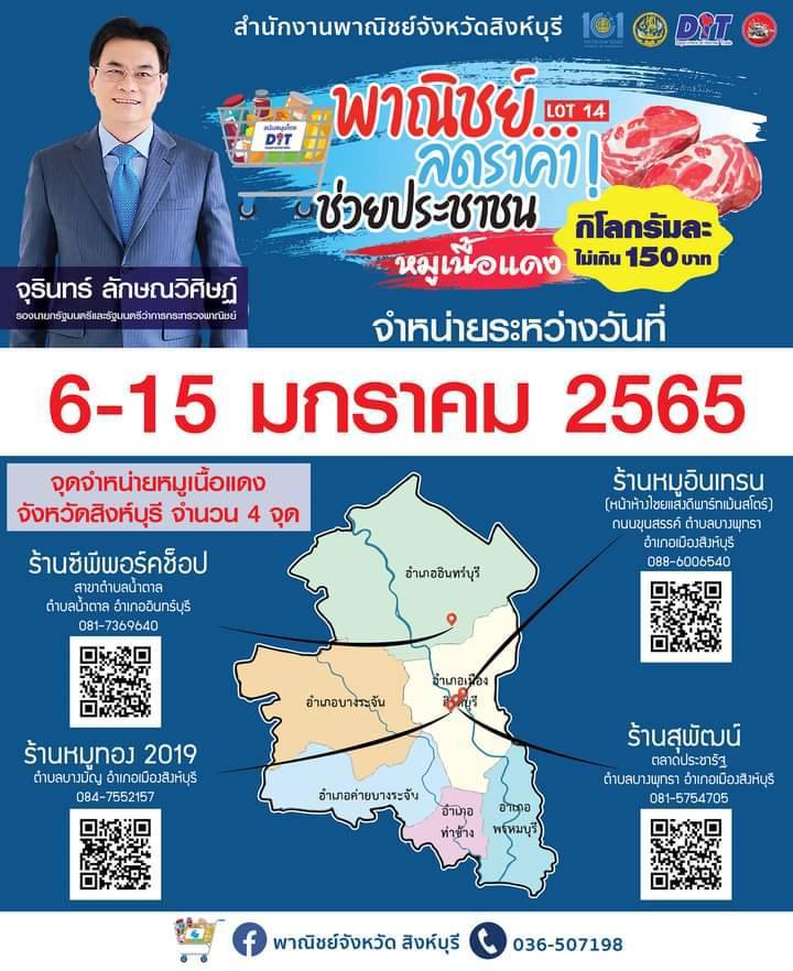 วันที่ 5 มกราคม 2565 นางวิมล เจริญฤทธิ์ พาณิชย์จังหวัดสิงห์บุรี ลงพื้นที่ติดตามสถานการณ์ราคาจำหน่ายสุกรมีชีวิต และสุกรชำแหละ ในพื้นที่จังหวัดสิงห์บุรี สุกรมีชีวิตหน้าฟาร์ม ราคาปรับสูงขึ้นอย่างต่อเนื่อง โดยราคาสุกรมีชีวิต กก.ละ 103-105 บาท สูงขึ้นจากวันที่ 28 ธันวาคม 2564 กก.ละ 3-5 บาท จึงส่งผลให้ราคาสุกรชำแหละในตลาดสดเทศบาลเมืองสิงห์บุรีปรับสูงขึ้นต่อเนื่องเช่นกัน หมูเนื้อแดง (ไหล่/สะโพก) ราคากิโลกรัมละ 190-200 บาท และหมูเนื้อแดงแช่แข็ง (ไหล่/สะโพก) ใน Shop ราคากิโลกรัมละ 164-188 บาท ในส่วนของห้างแม็คโคร สิงห์บุรี จัดโปรโมชั่น ลดราคาสุกรชำแหละเนื้อแดง (สะโพก) ราคากิโลกรัมละ 164 บาท /กก. สุกรชำแหละเนื้อแดง (หัวไหล่) ราคากิโลกรัมละ 165 บาท