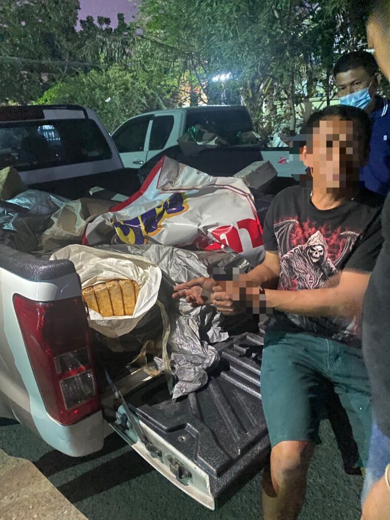เจ้าหน้าที่ตำรวจชุดจับกุมจึงได้แสดงตัวเข้าจับกุม พร้อมตรวจค้นรถยนต์คันดังกล่าวพบยาเสพติดให้โทษประเภท 5 (กัญชาอัดแท่ง) จำนวน 6 กระสอบ น้ำหนักรวมทั้งสิ้นประมาณ 240 กิโลกรัม พบวางอยู่ภายในห้องโดยสาร (แค๊ป) จำนวน 2 กระสอบ และอีก 4 กระสอบพบท้ายกระบะบรรทุกด้านหลังมีผ้าใบคลุมทับอยู่ จึงได้ทำการจับกุมตัวพร้อมตรวจยึดของกลาง มายัง กก.สส.บก.น.7 เพื่อซักถามขยายผล โดยนายอาภาพรฯ รับว่าตนได้รับการว่าจ้างจากนายอ้อ (ไม่ทราบชื่อสกุลจริง) ให้ขับรถยนต์บรรทุกยาเสพติด (กัญชา) จาก จ.นครพนม เพื่อไปส่งต่อที่วัดบางปิ้งฯ โดยได้ค่าจ่าง 10,000 บาท เดินทางมาพร้อมนายสุทธิพงษ์ฯ ซึ่งเป็นสาวประเภทสองที่เป็นคนรักที่อยู่กินกันมาประมาณ 1 ปี แล้ว ซึ่งนายอ้อฯ จะสั่งการมาทางโทรศัพท์ผ่านแอพพลิเคชั่นไลน์ว่าจะมีผู้มารับยาเสพติด (กัญชา)ไปแต่ตนไม่ทราบว่าเป็นผู้ใด