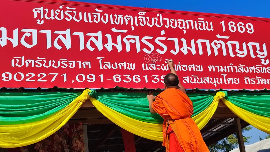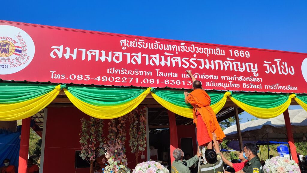ทั้งนี้ ได้ดำเนินการตั้งผ้าป่าสามัคคีในการจัดสร้างศูนย์วิทยุรับแจ้งเหตุเจ็บป่วยฉุกเฉินสมาคมอาสาสมัครร่วมกตัญญูเพชรบูรณ์ สาขาวังโป่ง และจัดซื้ออุปกรณ์ที่ใช้ในการกู้ชีพผู้ป่วยฉุกเฉิน โดยการได้รับความร่วมมือจากประชาชนและหลายภาคส่วนในการก่อสร้าง เพื่อสร้างเป็นศูนย์รับแจ้งเหตุเจ็บป่วยฉุกเฉิน ให้ประชาชนได้เข้าถึงการปฐมพยาบาลเบื้องต้น ก่อนนำส่งโรงพยาบาล เพื่อบริการส่งผู้ป่วยยากไร้ ไม่มีรถเดินทางไปรักษาตัวที่โรงพยาบาลวังโป่งได้ เพื่อซื้ออุปกรณ์กู้ชีพในการปฐมพยาบาลเบื้องต้นได้อย่างรวดเร็วและเหมาะสมก่อนนำส่งโรงพยาบาล และเพื่อเป็นศูนย์รับบริจาคโลงศพและขอรับโลงศพสำหรับผู้ป่วยยากไร้