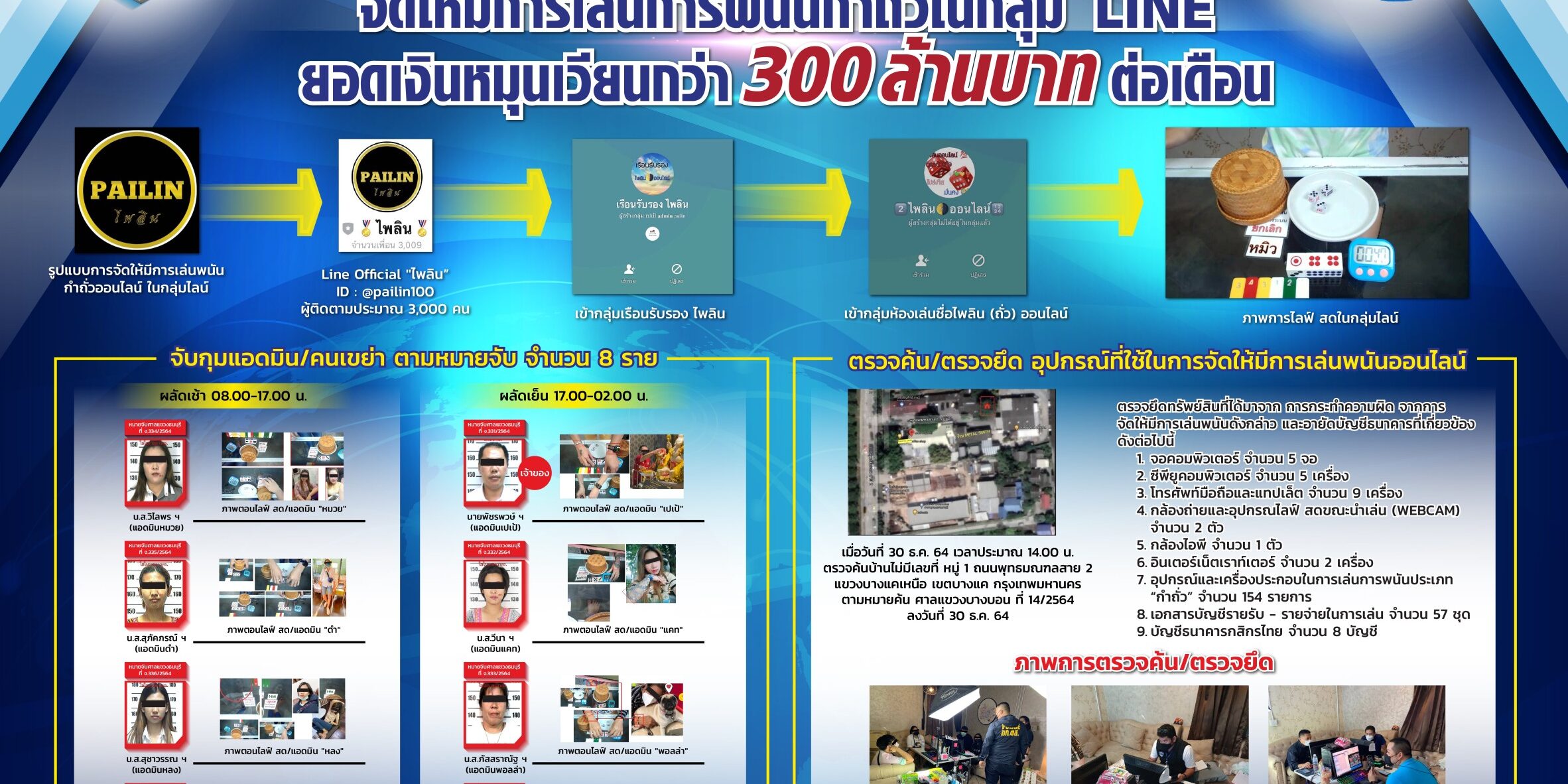 จากการรวบรวมพยานหลักฐานพบว่าเครือข่ายการพนันนี้ได้มีการจัดให้เล่นพนันผ่านแอปพลิเคชั่น ไลน์ ( LINE ) โดยกลุ่มผู้ต้องหาได้ร่วมกันจัดให้มีการเล่นพนันออนไลน์ประเภท “กําถั่ว” โดย Line Official ชื่อ ไพลิน (@pailin100) มีสมาชิกกว่า 3,000 คน โดยลักลอบเปิดให้มีการเล่นการพนันออนไลน์มาตั้งแต่เมื่อประมาณเดือน พ.ค.64 โดยมียอดเงินหมุนเวียนกว่าเดือนละ 300 ล้านบาท ในการปฏิบัติการครั้งนี้ ได้ตรวจยึดทรัพย์สินที่ได้มาจาก การกระทําความผิดจากการจัดให้มีการเล่นพนันดังกล่าวและอายัดบัญชีธนาคารที่เกี่ยวข้อง ดังต่อไปนี้