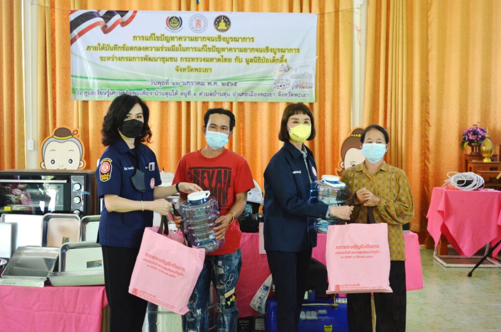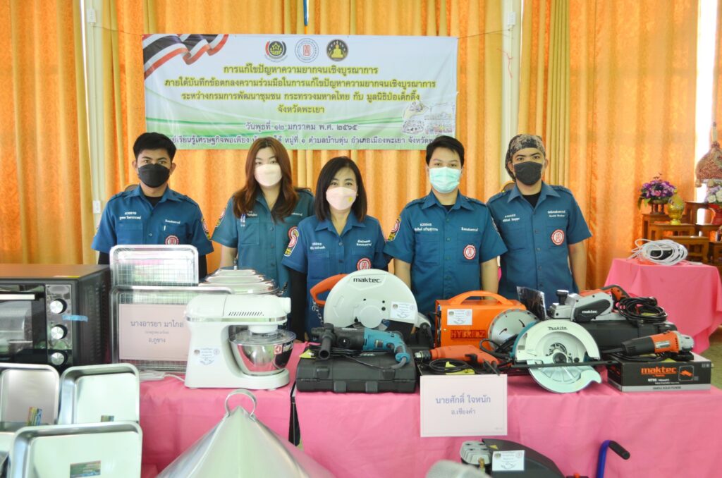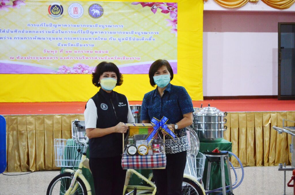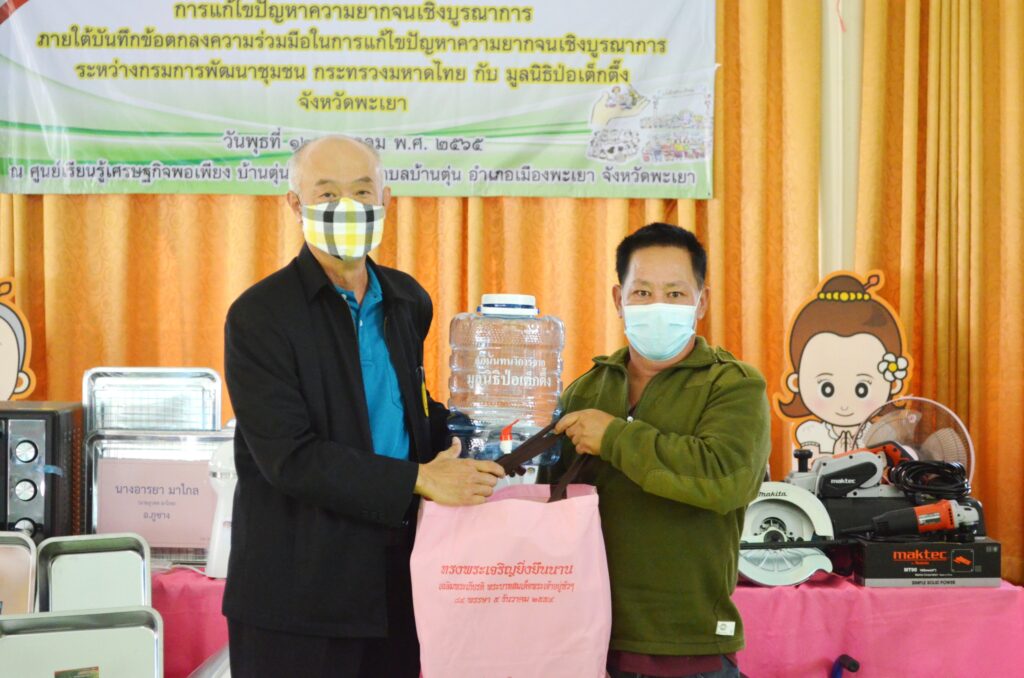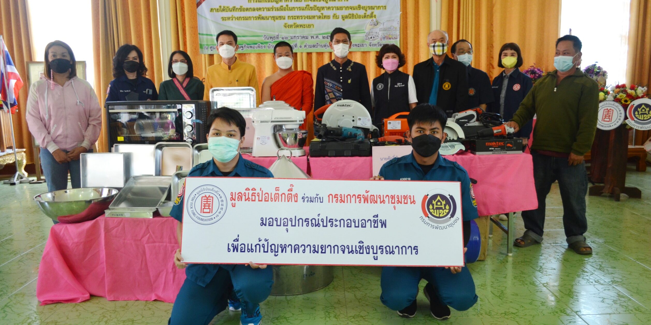 วานนี้ (วันพุธที่ 12 มกราคม 2565) มูลนิธิป่อเต็กตึ๊ง นำโดยนางศิริกุล โอภาสวงศ์ กรรมการและเลขาธิการ เป็นประธานในพิธี พร้อมด้วย นายสุรพงษ์ เตชะหรูวิจิตร กรรมการและรองเลขาธิการ และนางศิริพร กระจ่างหล้า รักษาการผู้จัดการฝ่ายสังคมสงเคราะห์ / หัวหน้าแผนกสังคมสงเคราะห์ นำทีมแผนกสังคมสงเคราะห์ ลงพื้นที่มอบอุปกรณ์การประกอบอาชีพให้กับครัวเรือนยากจนในพื้นที่จังหวัดพะเยาจำนวน 8 ครัวเรือน โดยมี นายศักดิ์ฤทธิ์ สลักคำ ผู้ว่าราชการจังหวัดพะเยา และ นายอาทร พิมชะนก ผู้ตรวจราชการกรมการพัฒนาชุมชน กระทรวงมหาดไทย เป็นประธานร่วมในพิธี พร้อมด้วย นายนิวัฒน์ ฤทธิ์วิวัฒน์ นายกสมาคมพะเยาและคณะกรรมการ ร่วมในพิธี ณ บริเวณศูนย์การเรียนรู้บ้านตุ่นใต้ อ.เมือง จ.พะเยา และในวันเดียวกันนี้ มูลนิธิฯ ได้มอบอุปกรณ์การประกอบอาชีพให้กับครัวเรือนยากจนจังหวัดเชียงราย จำนวน 20 ครัวเรือน โดยมี นายอาทร พิมชะนก ผู้ตรวจราชการกรมการพัฒนาชุมชน กระทรวงมหาดไทย เป็นประธานร่วมในพิธี พร้อมด้วย นางอำไพ บัวระดก รักษาการแทนพัฒนาการจังหวัดเชียงราย และคณะกรรมการมูลนิธิสาธารณกุศลสงเคราะห์เชียงราย ร่วมในพิธี ณ บริเวณห้องประชุมคชสาร องค์การบริหารส่วนจังหวัดเชียงราย อ.เมือง จ.เชียงราย รวมมอบอุปกรณ์ประกอบอาชีพ 2 จังหวัด รวม 28 ครัวเรือน รวมงบประมาณทั้งสิ้น 558,800 บาท (ห้าแสนห้าหมื่นแปดพันแปดร้อยบาทถ้วน) เพื่อส่งเสริมและสนับสนุนอาชีพแก่ครัวเรือนยากจนสามารถประกอบอาชีพเลี้ยงตนเองและครอบครัว ดำเนินชีวิตตามหลักปรัชญาเศรษฐกิจพอเพียง ภายใต้ ”บันทึกข้อตกลงความร่วมมือการแก้ไขปัญหาความยากจนเชิงบูรณาการ” ร่วมกับกรมการพัฒนาชุมชน กระทรวงมหาดไทย โดยมี นางศิริวรรณ โอภาสวงศ์ และ นางศิริพร โอภาสวงศ์ อาสาสมัครกิตติมศักดิ์มูลนิธิป่อเต็กตึ๊ง ร่วมในพิธี