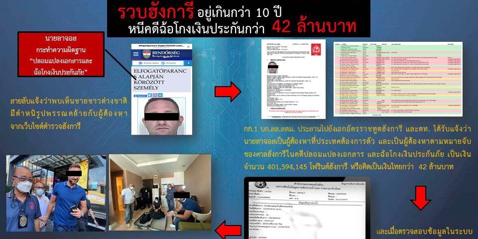 สืบเนื่องมาจาก เจ้าหน้าที่ตำรวจ กก.1 บก.สส.สตม. ได้รับแจ้งจากสายลับว่าได้พบเห็นชายชาวต่างชาติมีตำหนิรูปพรรณคล้ายกันกับผู้ต้องหาตามประกาศทางเว็บไซต์ของตำรวจประเทศฮังการี ชื่อนายลาจอส กระทำความผิดฐานปลอมแปลงเอกสาร และฉ้อโกงเงินประกันภัย โดยสายลับได้พบเห็นนายลาจอส ในย่านถนนเพชรบุรีตัดใหม่ แขวงบางกะปิ เขตห้วยขวาง กรุงเทพฯ เจ้าหน้าที่ตำรวจ กก.1 บก.สส.สตม. จึงได้ประสานงานสอบถามไปยังสถานเอกอัครราชทูตฮังการี ประจำประเทศไทย รับแจ้งว่า นายลาจอส เป็นบุคคลเดียวกันกับที่ทางการประเทศฮังการีต้องการตัว เจ้าหน้าที่ตำรวจ กก.1 บก.สส.สตม. จึงได้ตรวจสอบในระบบเทคโนโลยีสารสนเทศ ตม. พบว่า นายลาจอส เดินทางเข้ามาในประเทศไทยเมื่อวันที่ 16 มีนาคม 2553 วีซ่านักท่องเที่ยว 60 วัน ได้รับอนุญาตให้อยู่ในประเทศไทยถึงวันที่ 14 พฤษภาคม 2553 ซึ่งการอนุญาตให้อยู่ในราชอาณาจักรได้สิ้นสุดรวม จำนวน 4,254 วัน และยังพบว่า กองการต่างประเทศ สำนักงานตำรวจแห่งชาติ มีหนังสือ ที่ 0002.4/4127 ลงวันที่ 13 กรกฎาคม 2554 แจ้งว่า นายลาจอส เป็นผู้ต้องหาที่ทางการฮังการีต้องการตัวตามหมายจับของศาลฮังการีในความผิดฐานปลอมแปลงเอกสาร และฉ้อโกงเงินประกันภัย เป็นเงินจำนวน 401,394,145 โฟรินต์ฮังการี หรือคิดเป็นเงินไทยกว่า 42 ล้านบาท