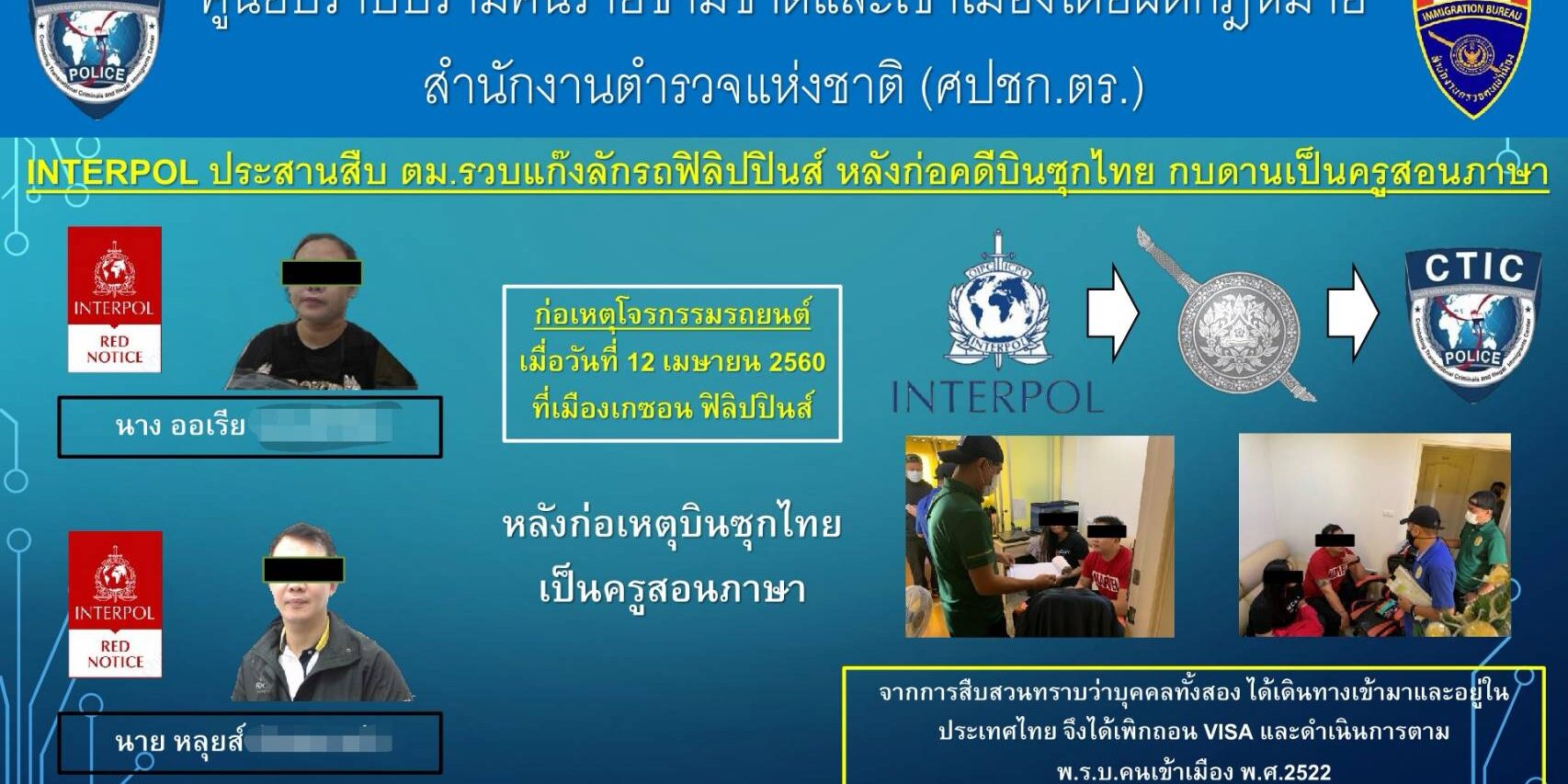 ศูนย์ปราบปรามคนร้ายข้ามชาติและเข้าเมืองโดยผิดกฎหมาย สำนักงานตำรวจแห่งชาติ (ศปชก.ตร.) ได้รับการประสานจากตำรวจสากลฟิลิปปินส์ (INTERPOL) ขอความร่วมมือให้ช่วยติดตาม นายหลุยส์ และ นางออเรีย สัญชาติฟิลิปปินส์ ซึ่งเป็นบุคคลต้องการตัวตามประกาศตำรวจสากลสีแดง (INTERPOL Red Notice) โดยเป็นผู้ต้องหาหลบหนีตามหมายจับศาลสาธารณรัฐฟิลิปปินส์ในข้อหาโจรกรรมรถยนต์ ได้เดินทางเข้ามาในประเทศไทย