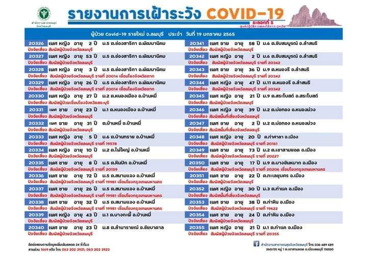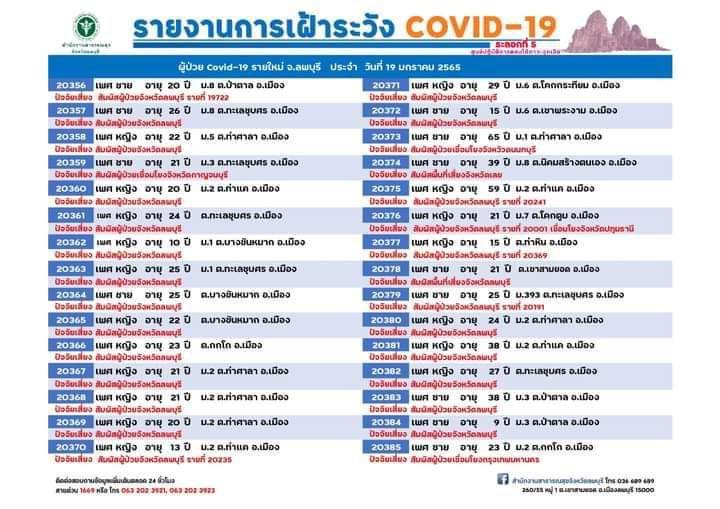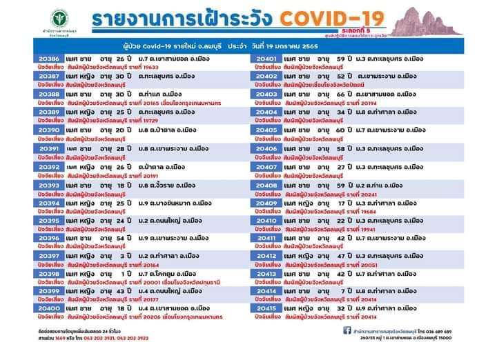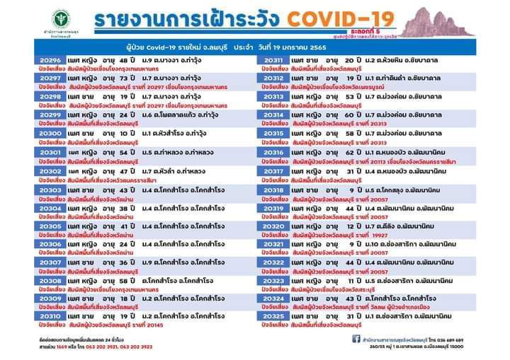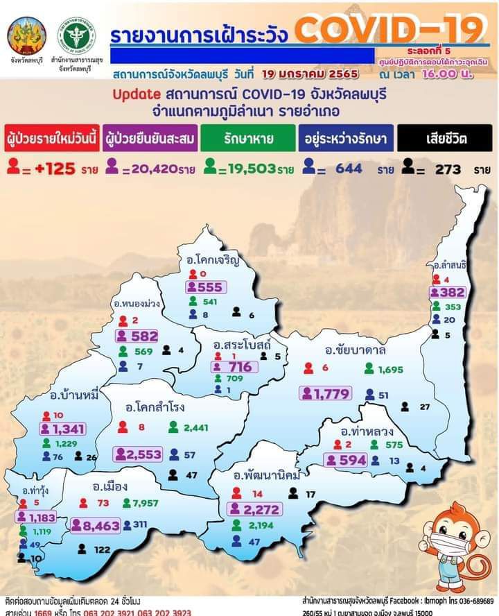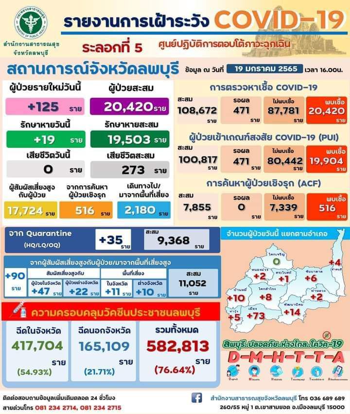 วันที่ 19 มกราคม 2565 ศูนย์ปฏิบัติการตอบโต้ภาวะฉุกเฉิน สำนักงานสาธารณสุขจังหวัดลพบุรี รายงานสถานการณ์โรคติดเชื้อไวรัสโคโรนา 2019 (โควิด-19) จังหวัดลพบุรี พบผู้ป่วยเพิ่ม 125 ราย (รายที่ 20,296-20,420) เป็นเพศหญิง 63 รายเพศชาย 62 ราย แยกเป็น อำเภอเมืองลพบุรี 73 ราย อำเภอพัฒนานิคม 14 ราย อำเภอบ้านหมี่ 10 ราย อำเภอโคกสำโรง 8 ราย อำเภอชัยบาดาล 6 ราย อำเภอท่าวุ้ง 5 ราย อำเภอลำสนธิ 4 ราย อำเภอหนองม่วง 2 ราย อำเภอท่าหลวง 2 ราย และอำเภอสระโบสถ์ 1 ราย