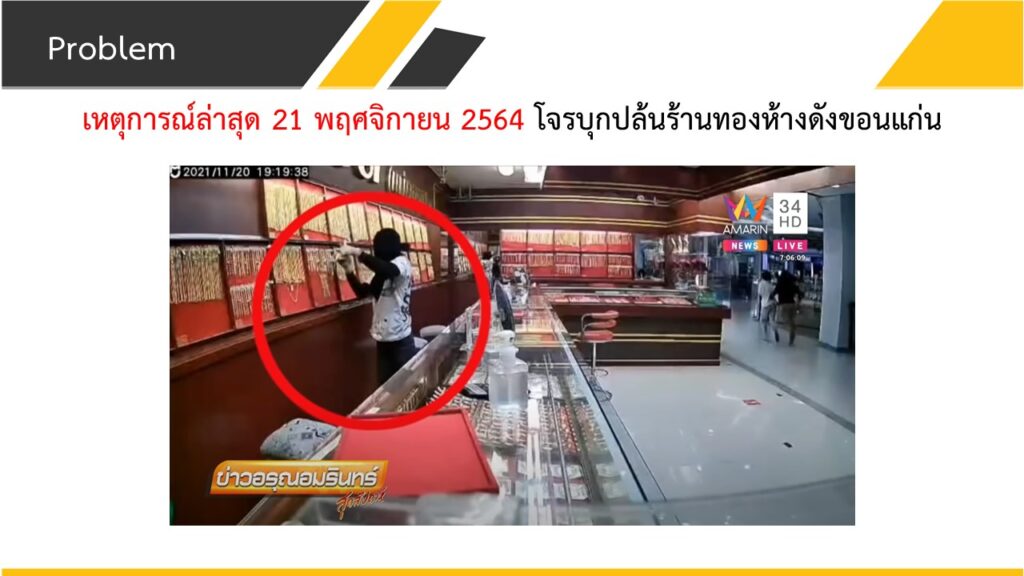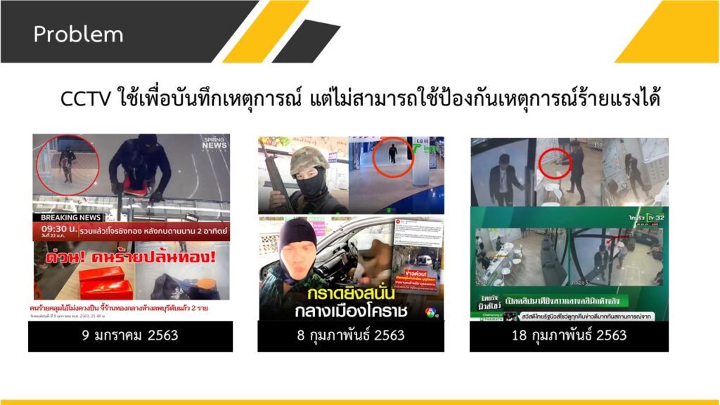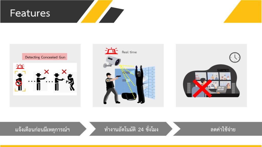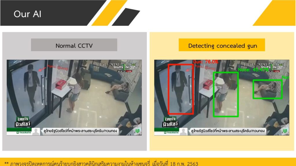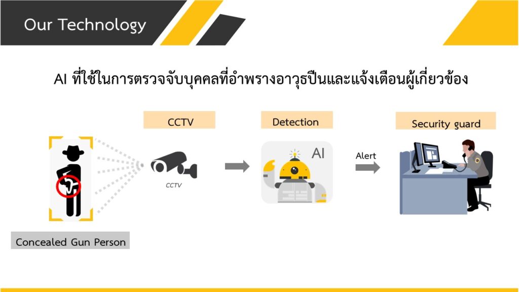 ดร.ธนพงศ์ อินทระ หัวหน้าคณะวิจัย กล่าวว่า การก่ออาชญากรรมเกิดขึ้นบ่อยครั้ง ทำให้เกิดความสูญเสียเป็นอย่างมาก ซึ่งเป็นเหตุให้ห้างสรรพสินค้า ร้านทอง และธนาคาร ต้องมีการทำประกันภัยอาชญากรรมเพื่อที่จะได้รับการชดเชยหากเกิดเหตุการณ์ที่ไม่คาดคิดขึ้น แต่อย่างไรก็ตามการชดเชยไม่อาจชดเชยชีวิตที่อาจมีการสูญเสียไปได้ ทางคณะผู้วิจัยจึงพัฒนา ระบบสำหรับตรวจจับบุคคลที่มีความเสี่ยงในการอำพรางอาวุธปืนโดยการวิเคราะห์วิดีโอจากกล้อง CCTV แบบ Realtime ด้วยเทคโนโลยีปัญญาประดิษฐ์ (Artificial Intelligence : AI) แบบการประมวลผลเชิงลึก (Deep Learning) โดย AI จะตรวจจับสิ่งที่อยู่ในเหตุการณ์ ซึ่งจะระบุทั้งบุคคลที่มีพฤติกรรมปกติ และที่แสดงพฤติกรรมที่มีความเสี่ยงในการอำพรางอาวุธปืน โดยการระบุว่าเป็นบุคคลกลุ่มใดจะใช้การประมวลผลเชิงลึก ในการแบ่งแยกบุคคลที่แสดงพฤติกรรมที่ต่างกัน และแจ้งเตือนไปยังบุคคลที่ระบุให้ได้รับข้อความแจ้งเตือน เพื่อดำเนินการป้องกันหรือระงับเหตุต่อไป ปัจจุบันระบบดังกล่าว อยู่ในระหว่างการพัฒนาระบบเพื่อนำไปใช้จริง ซึ่งจะช่วยให้ลดการเกิดความเสียหายทั้งทางด้านชีวิตและทรัพย์สิน ลดระดับการเกิดเหตุการณ์ความรุนแรงให้เล็กลง และเกิดการต่อยอดทางธุรกิจที่มาจากงานวิจัยต่อไป