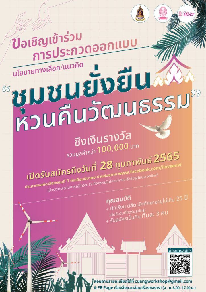 ทั้งนี้ นักเรียน นิสิต นักศึกษา หรือบุคคลทั่วไปที่มีอายุไม่เกิน 25 ปี (นับเวลาจนถึง 28 กุมภาพันธ์ 2565) สามารถอ่านรายละเอียดขั้นตอนและเงื่อนไขในการรับสมัคร และสมัครเข้าร่วมโครงการฯ ได้ที่ shorturl.at/tDJR6 หรือทาง QR Code ที่ปรากฏในโปสเตอร์ประชาสัมพันธ์ตั้งแต่บัดนี้จนถึง 28 กุมภาพันธ์ 2565 และหากมีข้อสงสัยเพิ่มเติมสามารถติดต่อสอบถามได้ที่ cuengworkshop@gmail.com หรือที่ facebook เพจ “เรื่องสิ่งแวดล้อมเรื่องของเรา” ในวันจันทร์ถึงศุกร์ ตั้งแต่เวลา 08.00–17.00 น.