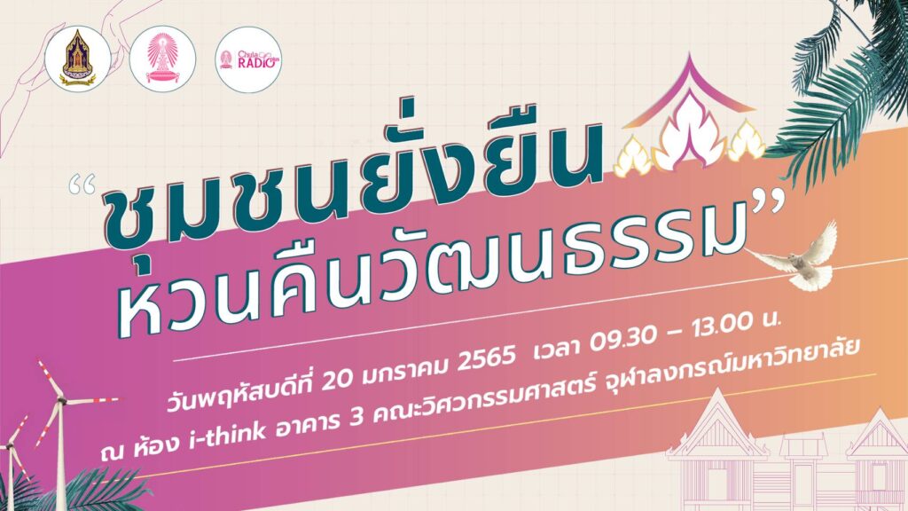 กระทรวงวัฒนธรรม ร่วมกับ คณะวิศวกรรมศาสตร์ จุฬาลงกรณ์มหาวิทยาลัย และ สถานีวิทยุแห่งจุฬาลงกรณ์มหาวิทยาลัย จัดโครงการประกวดนโยบายทางเลือกและแนวคิดริเริ่มการพัฒนาชุมชนยั่งยืน ภายใต้หัวข้อ “ชุมชนยั่งยืนหวนคืนวัฒนธรรม (Sustainable and Cultural Community)” มุ่งสร้างการมีส่วนร่วมจากทุกภาคส่วนในการพัฒนาชุมชนอย่างยั่งยืน ในขณะเดียวกันยังคงรักษาอัตลักษณ์และวัฒนธรรมของตนเองควบคู่ไปกับการพัฒนาดังกล่าว