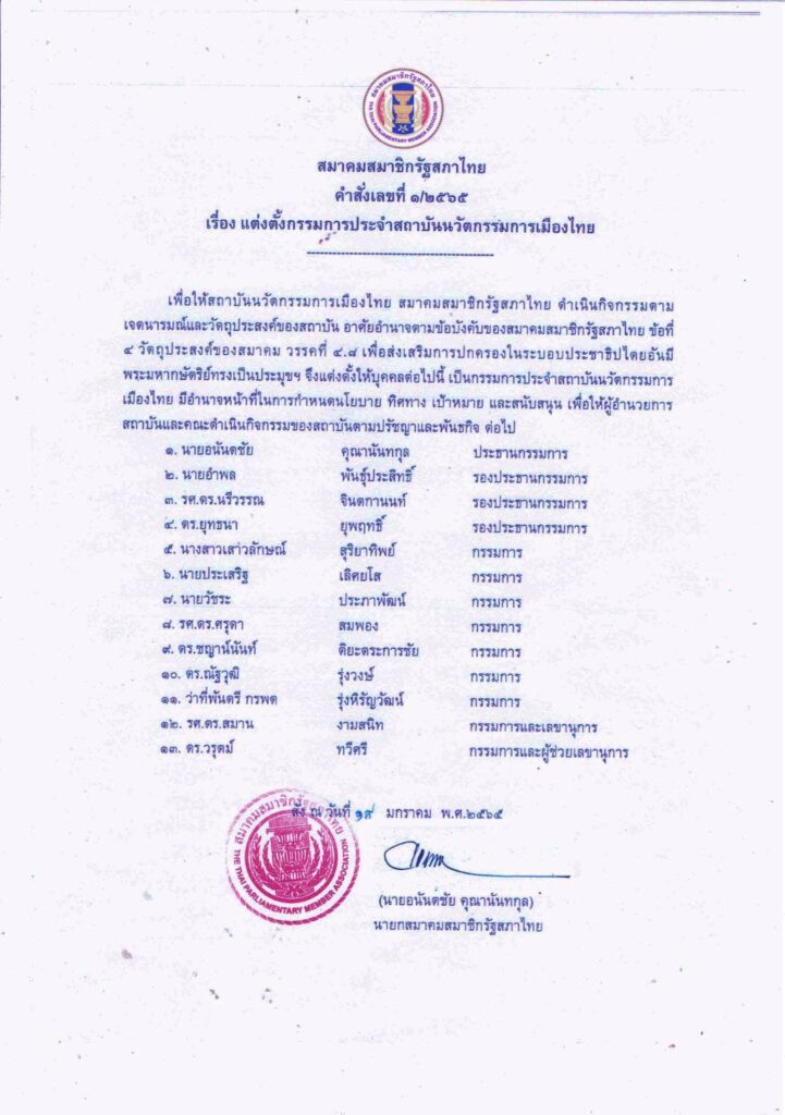 สถาบันนวัตกรรมการเมืองไทย สมาคมสมาชิกรัฐสภาไทย ได้ประกาศแต่งตั้ง ว่าที่ พันตรี กรพด รุ่งหิรัญวัฒน์ เป็น กรรมการประจำ สถาบันนวัตกรรมการเมืองไทย สมาคมสมาชิกรัฐสภาไทย โดยคำสั่งดังกล่าว ได้ประกาศแต่งตั้ง ณ วันที่ 18 มกราคม 2565