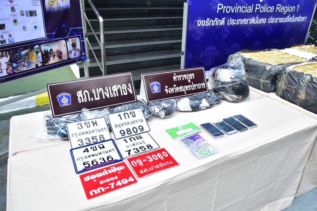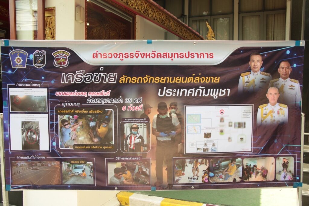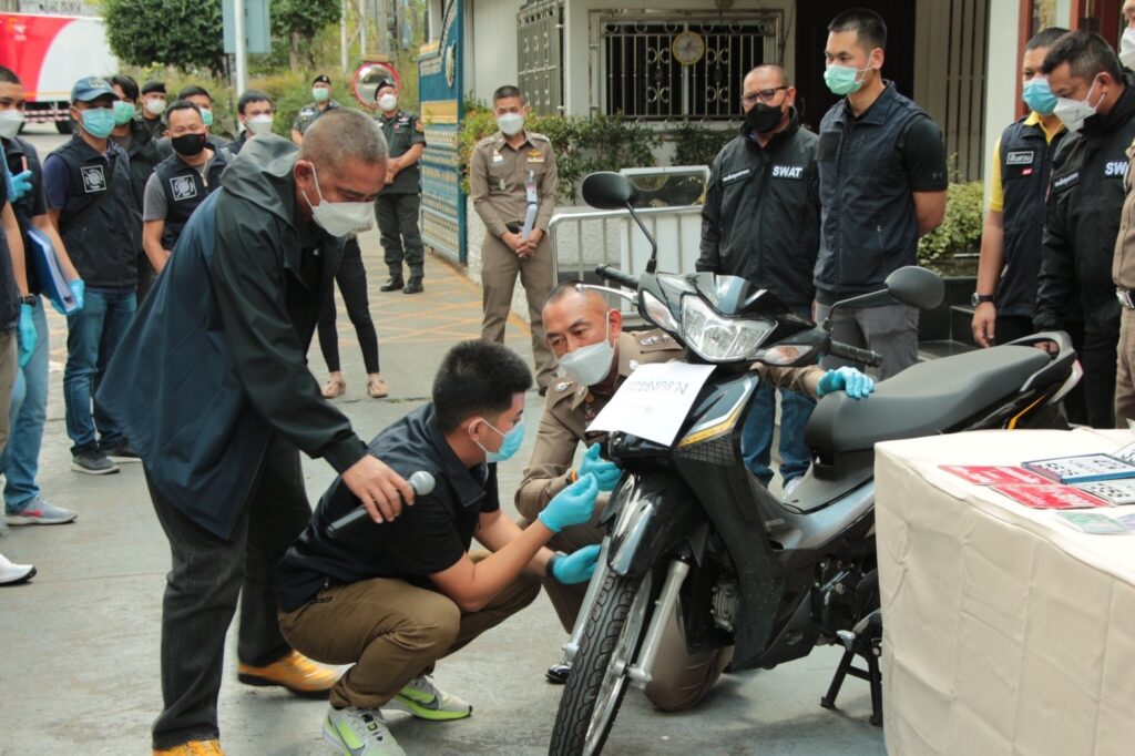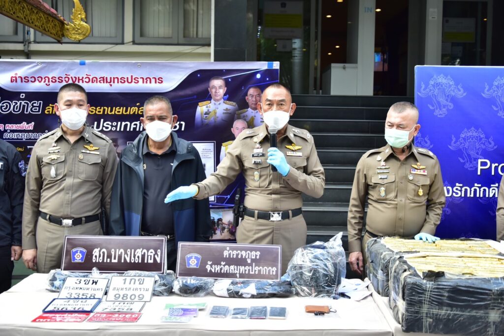 พร้อมด้วยของกลาง จักรยานยนต์ ยี่ห้อฮอนด้า สีดำ-เทา ทะเบียน 4 ขฆ 5585 กทม. จำนวน 1 คัน,รถยนต์ยี่ห้อ โตโยต้า รุ่น โซลูน่า สี น้ำตาล ทะเบียน กบ 4358 นครปฐม,รถยนต์ยี่ห้อ ฮอนด้า รุ่น ซิตี้ สี น้ำตาล ทะเบียน วฬ 8427 กทม.,อุปกรณ์เครื่องมือใช้ในการต่อสายตรงเพื่อติดเครื่องรถจักรยานยนต์ จำนวน 1 ชุด,เสื้อยืดคอกลม สีดำ เขียนอักษรภาษาอังกฤษ “POSITIVE” จำนวน 1 ตัว,เสื้อคลุมสีดำแขนยาว จำนวน 1 ตัว กางเกงยีน ขายาว จำนวน 1 ตัว,เสื้อยืดแขนยาวสีดำลายขาว จำนวน 1 ตัว,หมวกกันน็อค สีดำคาดขาว จำนวน 1 ใบ สีฟ้า จำนวน 1 ใบ,โทรศัพท์มือถือ จำนวน 4 เครื่อง,สมุดบัญชีเงินฝากธนาคารไทยพาณิชย์ สาขาตลาดบูรพาซิตี้ จำนวน 1 เล่ม,สมุดบัญชีเงินฝากธนาคารกสิกร ไทย สาขา Market Village Suvarnbhum จำนวน 1 เล่ม,สมุดคู่มือจดทะเบียน รถจักรยานยนต์ ทะเบียน 3 ขท 6020 กทม. จำนวน 1 เล่ม,แผ่นป้ายทะเบียนรถจักรยานยนต์ จำนวน 6 แผ่น (ป้ายแดง ฮอนด้าปิยะ กก-7494 ระยอง,ป้ายแดง 09-3060 สภ.บางปะกง,1 กฒ 7358 กาฬสินธุ์,4 ขฉ 5636 กทม.,3 ขพ 3358 กทม., 1 กข 9808 สมุทรสงคราม)