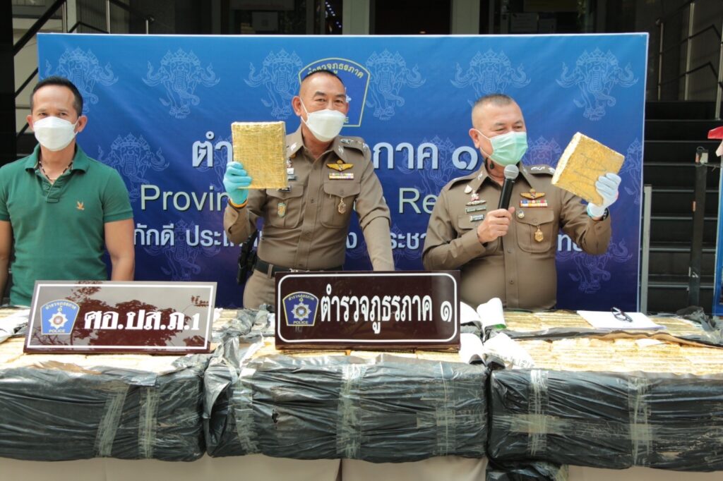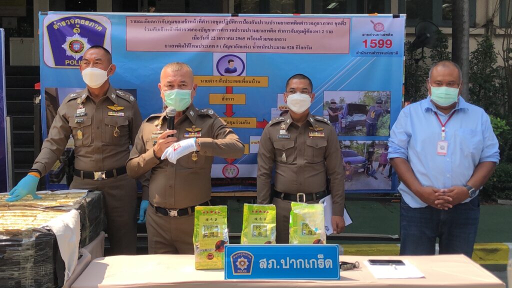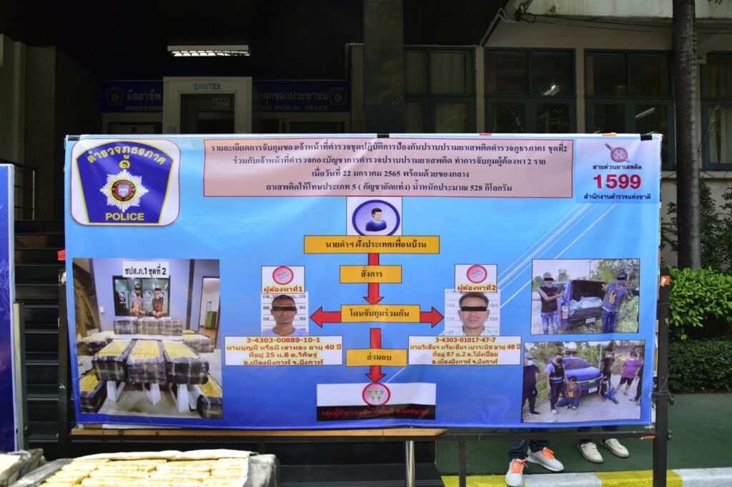 คดีที่ 2 ลักลอบขนกัญชาอัดแท่งกว่า 528 กิโลกรัม จับกุมผู้ต้องหา 2 ราย ได้แก่ นายบุญมีหรือมี เสาทอง อายุ 40 ปี อยู่บ้านเลขที่ 25 หมู่ 8 ต.วิศิษฐ์ อ.เมืองบึงกาฬ จ.บึงกาฬ และนายวิเชียรหรือเชียร เยาวะนิช อายุ 48 ปี อยู่บ้านเลขที่ 87 หมู่ 2 ต.โป่งเปือย อ.เมือง จ.บึงกาฬ พร้อมด้วยของกลาง ยาเสพติดให้โทษประเภท 5 (กัญชา) ซึ่งบรรจุอยู่ภายในกระสอบถุงปุ๋ย ห่อด้วย ถุงพลาสติกสีดํา พันทับด้วยพลาสติกใส จํานวน 12 กระสอบ (ประมาณ 528 กิโลกรัม) โดยแต่ละกระสอบจะมีกัญชา พันทับด้วยกระดาษฟรอยล์สีทอง กระสอบละ 44 ก้อน ซึ่งตรวจค้นพบอยู่ภายในกระบะบรรทุกท้ายรถยนต์กระบะยี่ห้อเชฟโรเลท สีน้ำเงิน หมายเลขทะเบียน 2 ฒผ 3605 กรุงเทพมหานคร และรถยนต์กระบะยี่ห้อเชฟโรเลท สีน้ำเงิน หมายเลขทะเบียน 2 ฒผ 3605 กรุงเทพมหานคร