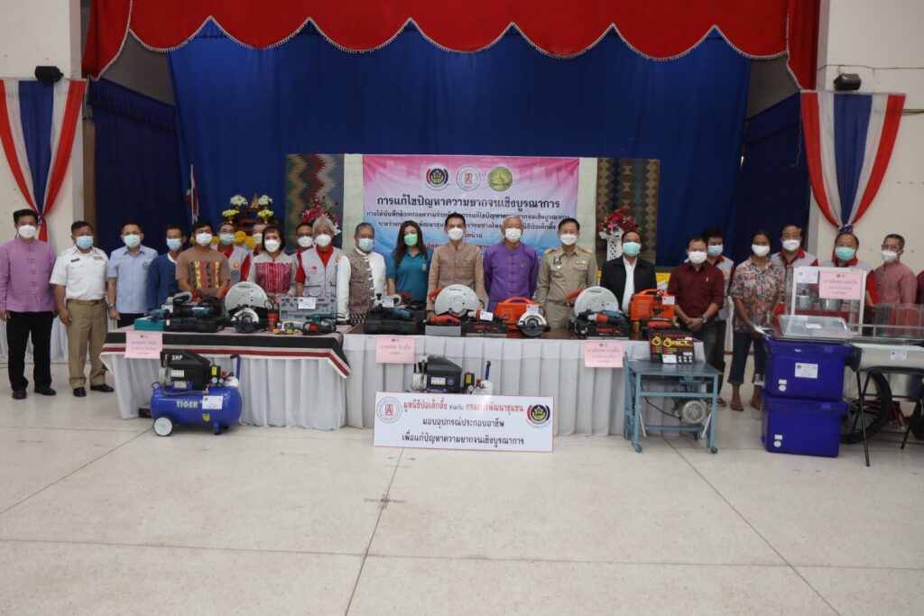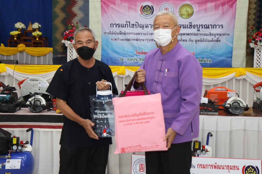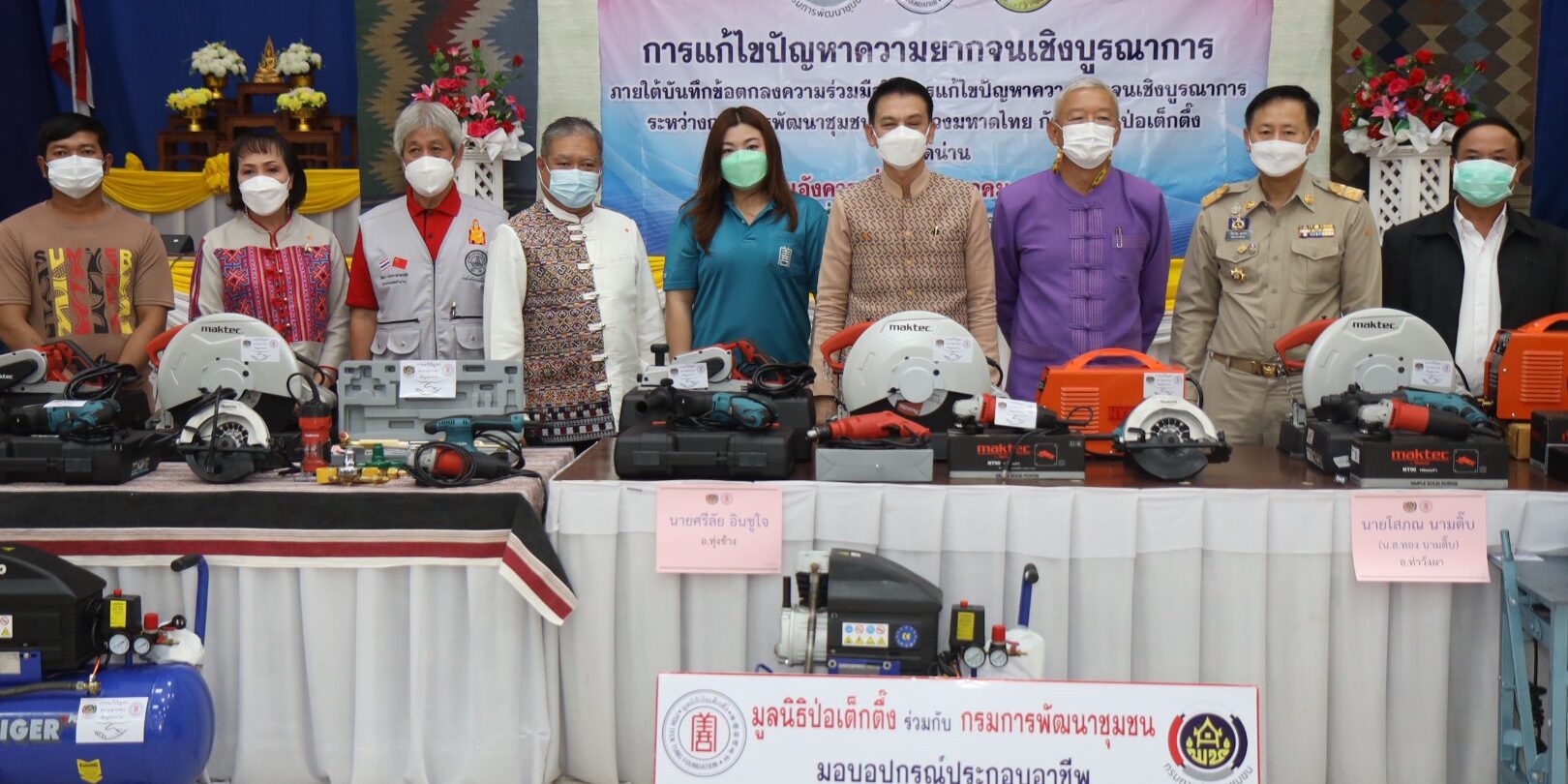 วานนี้ (วันอังคารที่ 25 มกราคม 2565 เวลา 13.30 น.) มูลนิธิป่อเต็กตึ๊ง นำโดย นางสาวศุภรัตน์ สมบัติเจริญไทย ผู้ช่วยหัวหน้าแผนกสังคมสงเคราะห์ เป็นประธานในพิธีมอบอุปกรณ์การประกอบอาชีพให้กับครัวเรือนยากจนในพื้นที่จังหวัดน่าน จำนวน 18 ครัวเรือน คิดเป็นมูลค่า จำนวน 316,450 บาท เพื่อส่งเสริมและสนับสนุนอาชีพแก่ครัวเรือนยากจนสามารถประกอบอาชีพเลี้ยงตนเองและครอบครัว ดำเนินชีวิตตามหลักปรัชญาเศรษฐกิจพอเพียง ภายใต้ ”บันทึกข้อตกลงความร่วมมือการแก้ไขปัญหาความยากจนเชิงบูรณาการ” ร่วมกับกรมการพัฒนาชุมชน กระทรวงมหาดไทย โดยมี นายกฤชเพชร เพชระบูรณิน รองผู้ว่าราชการจังหวัดน่าน และนายอาทร พิมชะนก ผู้ตรวจราชการกรมการพัฒนาชุมชน กระทรวงมหาดไทย เป็นประธานร่วมในพิธี พร้อมด้วย นายวิทยา จงประสาธน์สุข ประธานคณะกรรมการพ่อค้าน่านโรงเรียนซินจง จ.น่าน ร่วมในพิธี ณ บริเวณหอประชุมที่ว่าการอำเภอเมืองน่าน จังหวัดน่าน