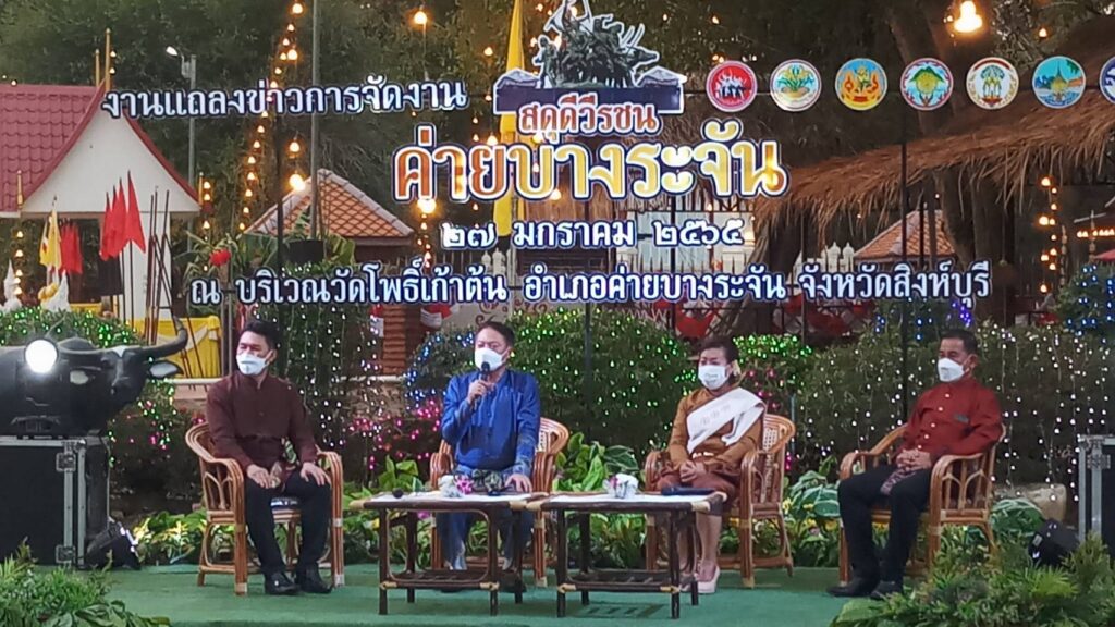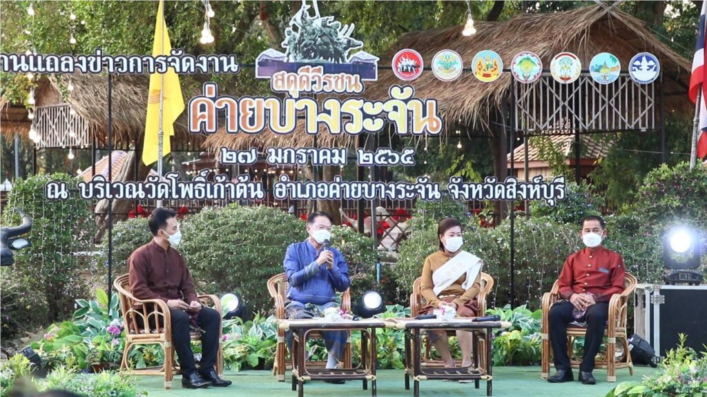 นายสัมฤทธิ์ กองเงิน รองผู้ว่าราชการจังหวัดสิงห์บุรี พร้อม นางสาวอนุชิดา อ้วนสกุล ท่องเที่ยวและกีฬาจังหวัดสิงห์บุรี นายถวิล ยี่สุ้นแสง พัฒนาการจังหวัดสิงห์บุรี และนายโชคชัย สาครพาณิชย์ นายแพทย์สาธารณสุขจังหวัดสิงห์บุรี แถลงข่าวงาน“สดุดีวีรชนค่ายบางระจัน” ประจำปี 2565 ณ บริเวณวัดโพธิ์เก้าต้น และ อุทยานวีรชนค่ายบางระจัน อ.ค่ายบางระจัน จ.สิงห์บุรี โดยงานจะมีขึ้นในระหว่างวันที่4 – 6 กุมภาพันธ์ 2565เพื่อเป็นการรำลึกถึงวีรกรรมอันยิ่งใหญ่ของเหล่าผู้กล้าชาวบ้านบางระจัน ความเสียสละ กล้าหาญและความรักภักดีต่อชาติ ซึ่งเป็นชาวบ้านกลุ่มเล็กๆที่มีหัวใจอันยิ่งใหญ่ มีเจตนารมณ์ที่ต้องการปกป้องผืนแผ่นดินไทย ได้รวมพลังกันก่อตั้งค่ายขึ้นมาต่อต้านกองทัพพม่าข้าศึก ต่อสู้จนได้รับชัยชนะถึง7ครั้ง เป็นเวลานานถึง 5 เดือน ก่อนที่จะพ่ายแพ้แก่กองทัพพม่าเมื่อวันแรม2ค่ำ เดือน8 ปีจอ พ.ศ. 2309 ชาวบ้านทุกคนมีหัวใจที่แข็งแกร่งปักหลักสู้อย่างกล้าหาญจนตัวตาย แม้จะล่วงเลยมา200ปี แต่ลูกหลานชาวสิงห์บุรีและชาวไทยทุกคนก็ไม่มีวันลืมวีรกรรมความกล้าหาญ จึงกำหนดให้ทุกวันที่4 กุมภาพันธ์ของทุกปี เป็นวันสดุดีวีรชนค่ายบางระจันและมีการจัดงานเฉลิมฉลองทุกปีตลอดมา โดยภายในงานมีกิจกรรมหลักที่น่าสนใจ ช่วงเช้าวันที่ 28 มกราคม 2565 พิธีบวงสรวงหลวงปู่ธรรมโชติและวีรชนค่ายบางระจันวันที่ 4 กุมภาพันธ์ 2565 พิธีสักการะพระอาจารย์ธรรมโชติ พิธีบวงสรวงดวงวิญญาณวีรชน พิธีสวนสนามและ ช่วงเย็นจะมีพิธีเปิดงานแสงสีเสียงยิ่งใหญ่ตระการตา ซึ่งตลอดทั้งวันที่ 4-6 กุมภาพันธ์ 2565 จะมีการแสดงแสง สี เสียง อีกทั้งการแสดงของศิลปินนักร้อง ลิเก พรเทพ พรทวี ศิลปะพื้นบ้านให้ชมกันฟรีๆ !!!พบกับศิลปินนักร้องชื่อดัง ลิเก พรเทพ พรทวี ชมการชกศึกมวยไทย พร้อมทั้งยังมีการจำหน่ายสินค้า OTOP และผลิตภัณฑ์ชุมชนกลุ่มจังหวัดภาคกลางตอนบนอีกด้วย