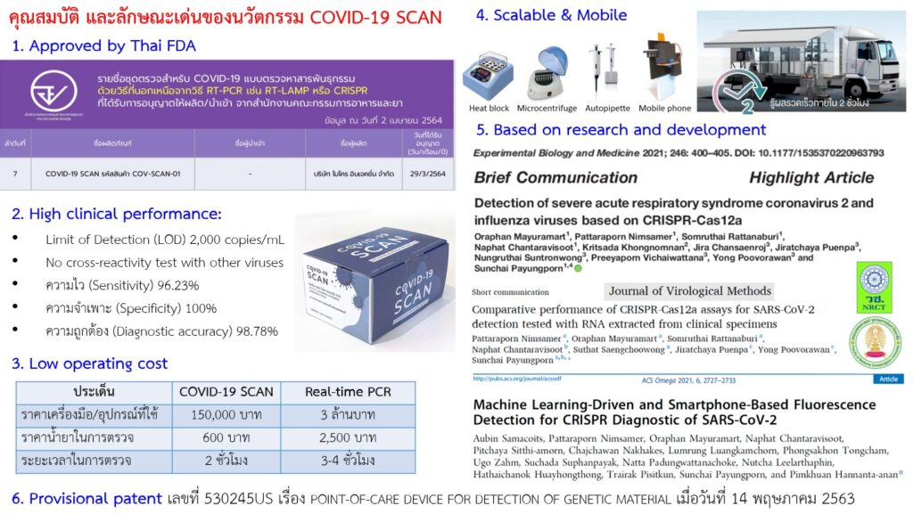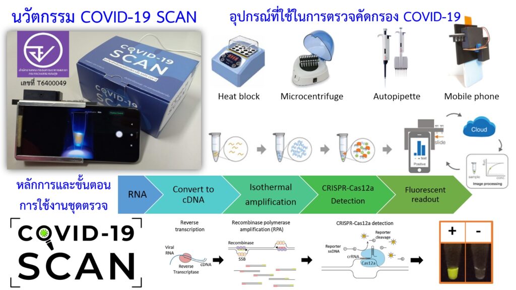 สถานการณ์การระบาดของ COVID-19 ก็คงดำเนินไปอย่างต่อเนื่อง ยอดผู้ป่วยโดยรวมทั่วโลกเพิ่มขึ้น หลายประเทศทั่วโลกขาดแคลนอุปกรณ์ทางการแพทย์ต่างๆ แต่ท่ามกลางวิกฤติ ก็มีนวัตกรรมการผลิตอุปกรณ์ทางการแพทย์เกิดขึ้นเช่นกัน รองศาสตราจารย์ ดร.สัญชัย พยุงภร และคณะ ได้คิดค้น ชุดตรวจคัดกรอง “โควิด-19 สแกน” โดยใช้เทคนิค RT-RPA และ CRISPR-Cas12a ในการตรวจ หากพบสารพันธุกรรมที่จำเพาะต่อเชื้อ SARS-CoV2 จะเกิดการเรืองแสง ก็จะสามารถตรวจวัดได้ด้วยโทรศัพท์มือถือที่มีโปรแกรมในการประมวลผลอย่างรวดเร็วด้วยระบบปัญญาประดิษฐ์ (AI) ประสิทธิภาพในการตรวจเทียบเท่าวิธีมาตรฐานสากล