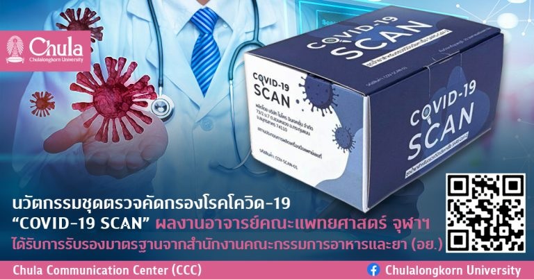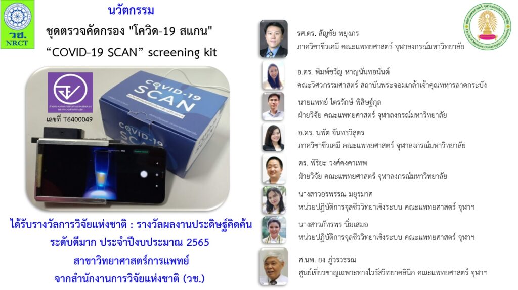 รองศาสตราจารย์ ดร.สัญชัย พยุงภร อาจารย์ประจำคณะแพทย์ศาสตร์ จุฬาลงกรณ์มหาวิทยาลัย กล่าวว่า นวัตกรรมชุดตรวจคัดกรอง “โควิด-19 สแกน” มีราคาไม่แพง เครื่องมือไม่ซับซ้อน ใช้งานง่าย สามารถตรวจคัดกรองนอกสถานที่ อีกทั้งได้รับการประเมินรับรองและอนุญาตให้ผลิต จากสำนักงานคณะกรรมการอาหารและยา (อย.) เลขที่ T6400049 จึงมีประโยชน์ในการตรวจคัดกรองเชิงรุกอย่างแพร่หลายทั่วทุกภูมิภาค ซึ่งส่งผลให้สามารถควบคุมการระบาดของเชื้อไวรัสได้อย่างมีประสิทธิภาพ