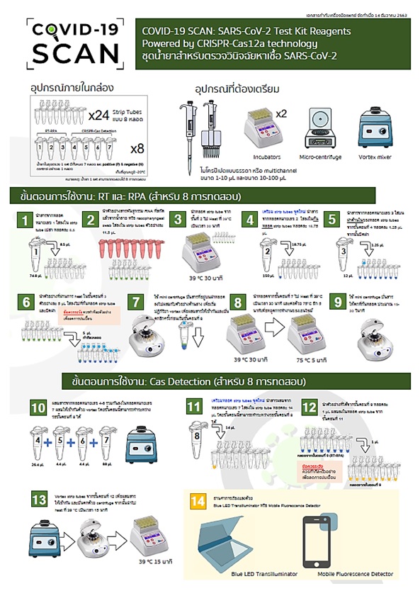 ส่วนประกอบของนวัตกรรมชุดตรวจคัดกรอง “โควิด-19 สแกน”ประกอบด้วย ชุดน้ำยาโควิด-19 สแกน ที่มีประสิทธิภาพ (ความแม่นยำ 98.78%) ใกล้เคียงกับ Real-time PCR ที่เป็นเทคนิคมาตรฐาน และโทรศัพท์มือถือที่มีโปรแกรมประมวลผลได้อย่างรวดเร็ว ส่วนวิธีการใช้ เริ่มจากเก็บตัวอย่างน้ำลาย แล้วสกัด RNA ด้วยวิธีที่เหมาะสม ต่อมาแปลงสารพันธุกรรมจาก RNA เป็น cDNA ด้วยวิธี Reverse transcription และเพิ่มจำนวนสารพันธุกรรมแบบ isothermal amplification ด้วยวิธี recombinase polymerase amplification (RPA) จากนั้นตรวจหาสารพันธุกรรมของไวรัส SARS-CoV-2 ได้อย่างจำเพาะด้วยระบบ CRISPR-Cas12a