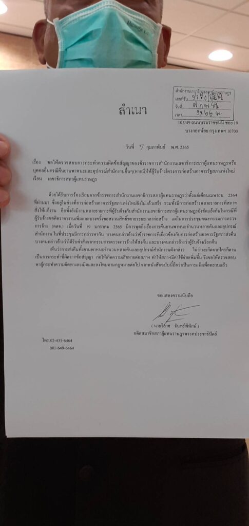 อีก 1 ฉบับกรณีได้รับการร้องเรียนจากข้าราชการสำนักงานเลขาธิการสภาผู้แทนราษฎรว่าตั้งแต่เดือนเม.ย. 64 ซึ่งอยู่ในช่วงที่การก่อสร้างอาคารรัฐสภาแห่งใหม่ยังไม่แล้วเสร็จ รวมทั้งมีการก่อสร้างหลายรายการที่สภาฯสั่งให้แก้งาน อีกทั้งยังมีงานหลายรายการที่ผู้รับจ้างกับสำนักงานเลขาธิการสภาผู้แทนราษฎรยังขัดแย้งกันในกรณีที่ผู้รับจ้างขอคิดราคางานเพิ่มและบางครั้งขอสงวนสิทธิ์ขยายระยะเวลาก่อสร้าง แต่ในการประชุมคณะกรรมการตรวจการจ้าง (คตจ.) เมื่อวันที่ 19 ม.ค. 65 มีการพูดถึงเรื่องการคืนยานพาหนะจำนวนหลายคันและอุปกรณ์สำนักงาน ในที่ประชุมมีการกล่าวหากันว่าข้าราชการที่เกี่ยวข้องกับการก่อสร้างอาคารรัฐสภาส่งคืน บางคนกล่าวอ้างว่าได้รับคำสั่งจากกรรมการตรวจการจ้างให้ส่งคืน และบางคนกล่าวอ้างว่าผู้รับจ้างเรียกคืน เห็นว่าการส่งคืนทั้งยานพาหนะจำนวนหลายคันและอุปกรณ์สำนักงานดังกล่าว ไม่ว่าจะเกิดจากใครก็ตาม เป็นการกระทำที่ผิดจากข้อสัญญา ก่อให้เกิดความเสียหายต่อสภาฯ ทำให้สภาฯมีค่าใช้จ่ายเพิ่มขึ้น จึงขอให้ตรวจสอบหาผู้กระทำความผิดทางละเมิดและลงโทษตามกฎหมายต่อไป