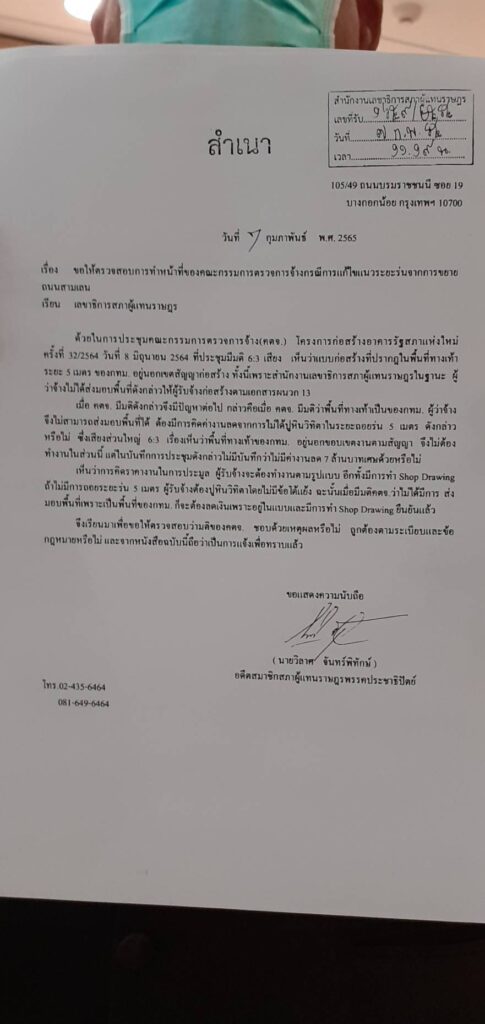 วันนี้ (7ก.พ.65) เวลา 11:22 น. ที่อาคารรัฐสภา นายวิลาศ จันทร์พิทักษ์ อดีตส.ส.พรรคประชาธิปัตย์ ยื่นหนังสือถึงนางพรพิศ เพชรเจริญ เลขาธิการสภาผู้แทนราษฎรให้ตรวจสอบการทำหน้าที่ของคณะกรรมการตรวจการจ้างกรณีการแก้ไขแนวระยะร่นจากการขยายถนนสามเสน จากกรณีในการประชุมคณะกรรมการตรวจการจ้าง(คตจ.) โครงการก่อสร้างอาคารรัฐสภาแห่งใหม่ครั้งที่ 32/2564 วันที่ 8 มิ.ย. 64 ที่ประชุมมีมติ 6:3 เสียง เห็นว่าแบบก่อสร้างที่ปรากฎในพื้นที่ทางเท้าระยะ 5 เมตร ของกทม. อยู่นอกเขตสัญญาก่อสร้าง ทั้งนี้เพราะสำนักงานเลขาธิการสภาผู้แทนราษฎรในฐานะผู้ว่าจ้างไม่ได้ส่งมอบพื้นที่ดังกล่าวให้ผู้รับจ้างก่อสร้างตามเอกสารผนวก 13 เมื่อ คตจ. มีมติดังกล่าวจึงมีปัญหาต่อไป กล่าวคือเมื่อ คตจ. มีมติว่าพื้นที่ทางเท้าเป็นของกทม. ผู้ว่าจ้างจึงไม่สามารถส่งมอบพื้นที่ได้ ต้องมีการคิดค่างานลดจากการไม่ได้ปูหินวิทิตาในระยะถอยร่น 5 เมตรดังกล่าว