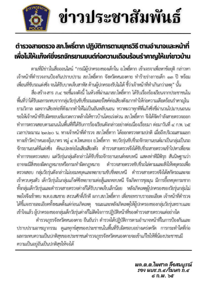 วันที่ 8 ก.พ.65 : ตามที่มีข่าวในสื่อออนไลน์ “กรณีผู้ปกครองของเด็กใน อ.โพธิ์ตาก เข้าเจรจาเพื่อหาข้อยุติ กล่าวหา เจ้าหน้าที่ตำรวจงานป้องกันปราบปราม สภ.โพธิ์ตาก จังหวัดหนองคาย ทำร้ายร่างกายเด็ก 13 ปี พร้อมเพื่อนที่ขับรถแต่งซิ่ง จนได้รับบาดเจ็บสาหัส ด้านผู้ปกครองรับไม่ได้ ชี้ว่าเจ้าหน้าที่ทำเกินกว่าเหตุ” นั้น
