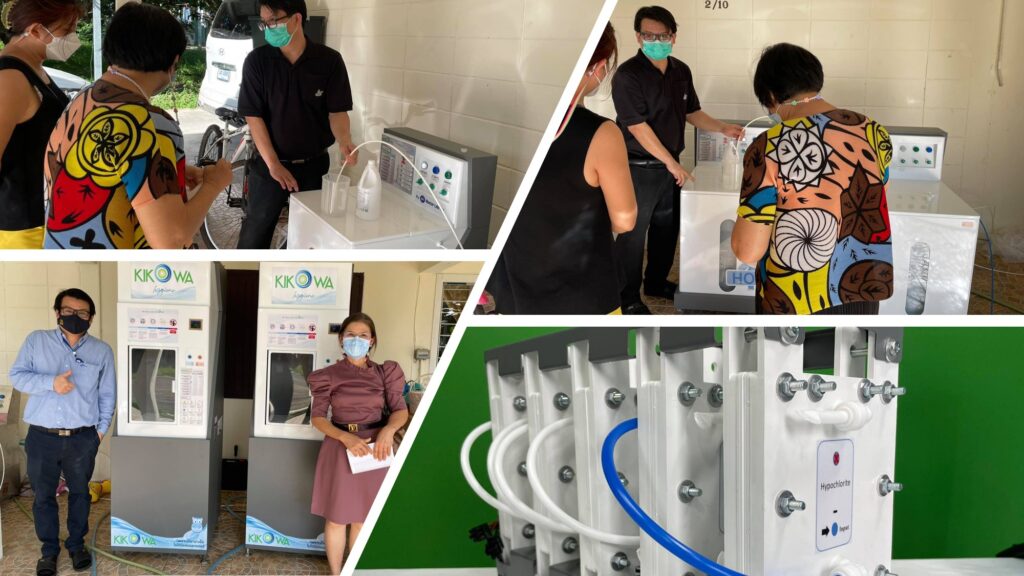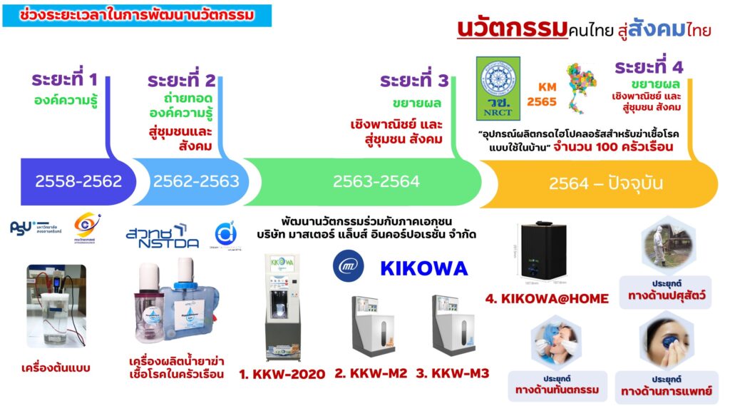 การทดลองใช้ ทางนักวิจัยได้มีการขยายผลต่อยอดไปสู่การใช้ประโยชน์ โดยการถ่ายทอดองค์ความรู้ให้แก่ บริษัท มาสเตอร์แล็บส์ อินคอร์ปอเรชั่น จำกัด เพื่อดำเนินการผลิตเครื่องผลิตน้ำยาฆ่าเชื้อโซเดียมไฮโปคลอไรด์และไฮโปคลอรัส (KIKOWA) เพื่อผลิตน้ำยาฆ่าเชื้อไวรัส เชื้อราในทุกสภาพพื้นผิว มีความปลอดภัยสูง โดยอาศัยน้ำและเกลือผ่านระบบเทคโนโลยีเฉพาะ โดย ม.อ. ได้รับมอบเครื่องผลิตน้ำยาฆ่าเชื้อ KIKOWA เพื่อนำไปใช้ทั้ง 5 วิทยาเขต ได้แก่ วิทยาเขตสุราษฎร์ธานี,วิทยาเขตปัตตานี,วิทยาเขตตรัง,วิทยาเขตหาดใหญ่ และ วิทยาเขตภูเก็ต จำนวน 2 รุ่น