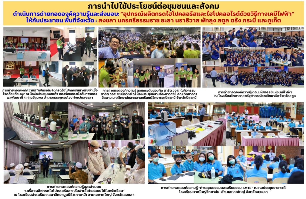 มหาวิทยาลัยสงขลานครินทร์ (ม.อ.) พัฒนาเครื่องผลิตน้ำยาฆ่าเชื้อที่มีประสิทธิภาพสูง ราคาถูก และปลอดภัย อาศัยเทคโนโลยีอิเล็กโทรลิซิสของไทยสำเร็จ รับรางวัลการวิจัยแห่งชาติ : รางวัลผลงานประดิษฐ์คิดค้น ระดับดี ปี 2565 จาก สำนักงานการวิจัยแห่งชาติ (วช.) กระทรวงการอุดมศึกษา วิทยาศาสตร์ วิจัยและนวัตกรรม