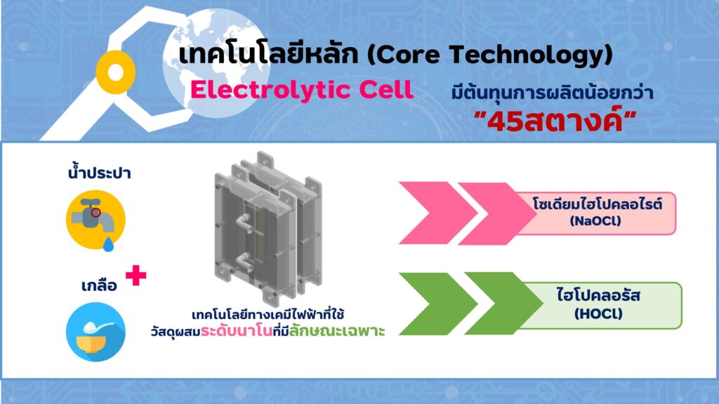 “เครื่องผลิตน้ำยาฆ่าเชื้อที่มีประสิทธิภาพสูง” ได้มีกระบวนการผลิตกรดไฮโปคลอรัสและไฮโปคลอไรต์เพื่อทดแทนน้ำยาฆ่าเชื้อซึ่งไม่ได้มีเพียงเอทานอลเท่านั้น นำองค์ความรู้จากวิชาเคมีไฟฟ้าในการผลิต โดยจากการจ่ายศักย์ไฟฟ้าและกระแสไฟฟ้าให้แก่ขั้วไฟฟ้า แผ่นวัสดุนำไฟฟ้าขั้วแอโนด (ขั้วบวก) ที่จุ่มอยู่ในภาชนะบรรจุสารละลายเกลือแกง จะเกิดปฏิกิริยาออกซิเดชันที่บริเวณผิวหน้าได้ผลิตภัณฑ์เป็นกรดกรดไฮโปคลอรัส ที่มีพีเอชอยู่ในช่วง 4.0 ถึง 6.5 ซึ่งมีลักษณะเป็นกรดอ่อน มีค่า Oxidation-Reduction potential สูง สำหรับแผ่นวัสดุนำไฟฟ้าขั้วแคโทด (ขั้วลบ) ที่จุ่มอยู่ในขวดบรรจุสารจะเกิดปฏิกิริยารีดักชันที่บริเวณผิวหน้าได้ผลิตภัณฑ์เป็นโซเดียมไฮดรอกไซด์ ซึ่งมีพีเอชอยู่ในช่วง 8 ถึง 14