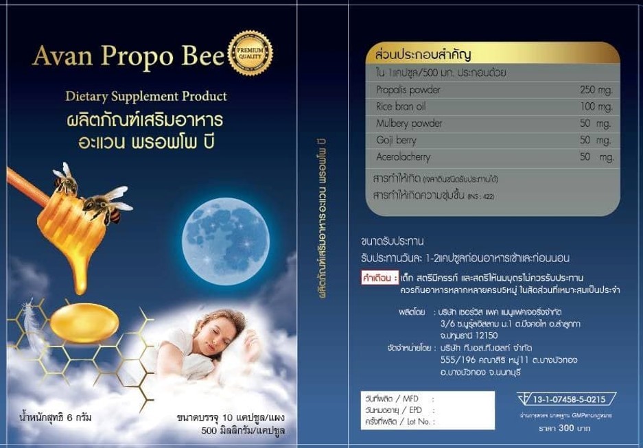 ปัจจุบัน “Avan propo Bee” ผลิตภัณฑ์เพื่อสุขภาพเติมเต็มสุนทรียภาพแห่งการนอนหลับ ได้จดทะเบียนอาหารและยา กับสำนักงานคณะกรรมการอาหารและยา (อย.) กระทรวงสาธารณสุข อย่างถูกต้องใน ปี พ.ศ.2563 แล้ว และตอนนี้ได้มีการจำหน่ายให้กับประชาชนผู้สนใจเป็นที่เรียบร้อยแล้ว