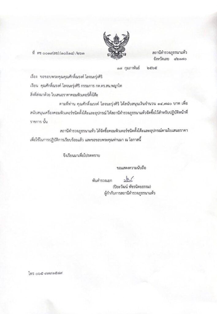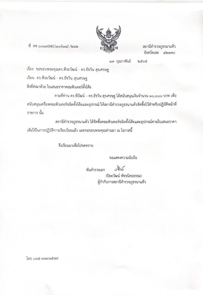 เมื่อเร็วๆนี้ : ดร.พีรวัฒน์ สุรเศรษฐ ประธานกต.ตร.กทม.(ภาคประชาชน)-สน.ชนะสงคราม,ดร.ธัชวิน สุรเศรษฐ ประธานกต.ตร.บก.น.1-กองบังคับการปฏิบัติการพิเศษ (191),คุณศักดิ์ณรงค์ โลจนะรุ่งสิริ กต.ตร.กทม. และ ร.ต.อ.เรืองยศ ขันสรุวรรณ ร่วมสนับสนุนคอมพิวเตอร์ตั้งโต๊ะพร้อมอุปกรณ์ให้แก่ข้าราชการตำรวจสถานีตำรวจภูธร นาแห้ว จังหวัดเลย เพื่อใช้ในการปฏิบัติหน้าที่ราชการ