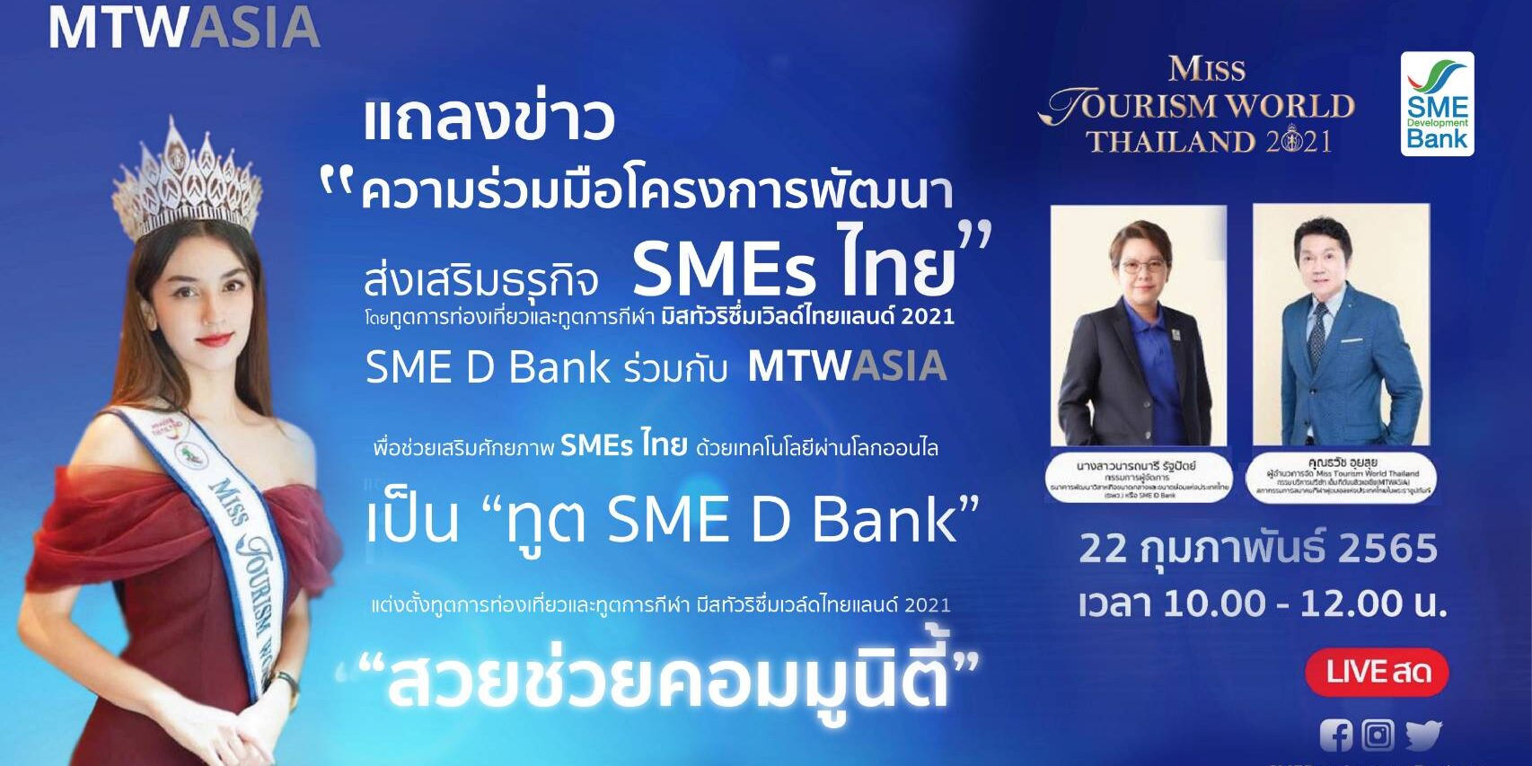 เรียกได้ว่าเป็นความร่วมมือระหว่างสองหน่วยงานยักษ์ใหญ่ ที่จะมาช่วยสนับสนุนผู้ประกอบการเอสเอ็มอีไทย และส่งเสริมเศรษฐกิจ โดยเฉพาะด้านการท่องเที่ยวไทย โดยธนาคารพัฒนาวิสาหกิจขนาดกลางและขนาดย่อมแห่งประเทศไทย (ธพว.) หรือ SME D Bank ในฐานะธนาคารเพื่อเอสเอ็มอีไทย เตรียมแถลงข่าวความร่วมมือกับ บริษัท MTW(ASIA) จำกัด ผู้ถือสิทธิในการประกวด “Miss Tourism World Thailand” ดำเนิน “โครงการพัฒนา ส่งเสริมธุรกิจ SMEs ไทย” โดยมอบหมายให้สาวงาม 77 ท่าน ที่เป็น “ทูตการท่องเที่ยวและทูตการกีฬา ประจำจังหวัด 77จังหวัด” ทำหน้าที่เป็นตัวแทนช่วยประชาสัมพันธ์ และทำการตลาดให้แก่ผู้ประกอบการเอสเอ็มอีไทยทั่วประเทศ รวมถึง ส่งเสริมการท่องเที่ยวทั่วประเทศ ผ่านสื่อต่างๆทั้งระบบออฟไลน์และระบบออนไลน์ที่กำลังได้รับความนิยมอย่างสูง