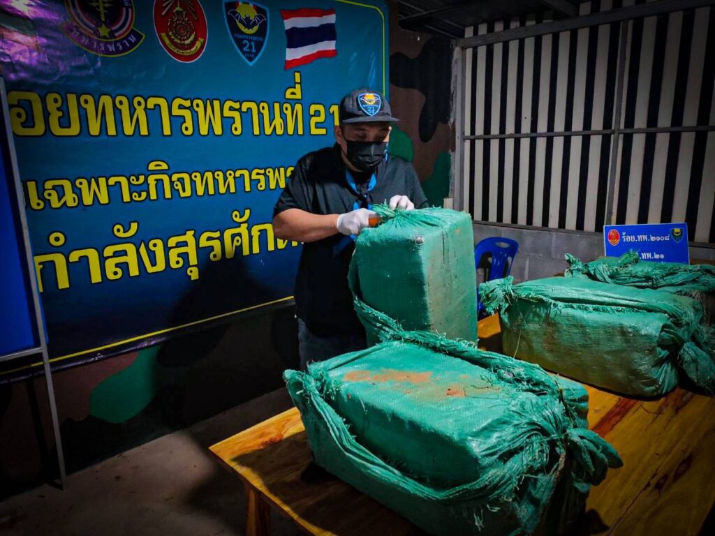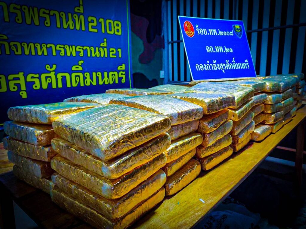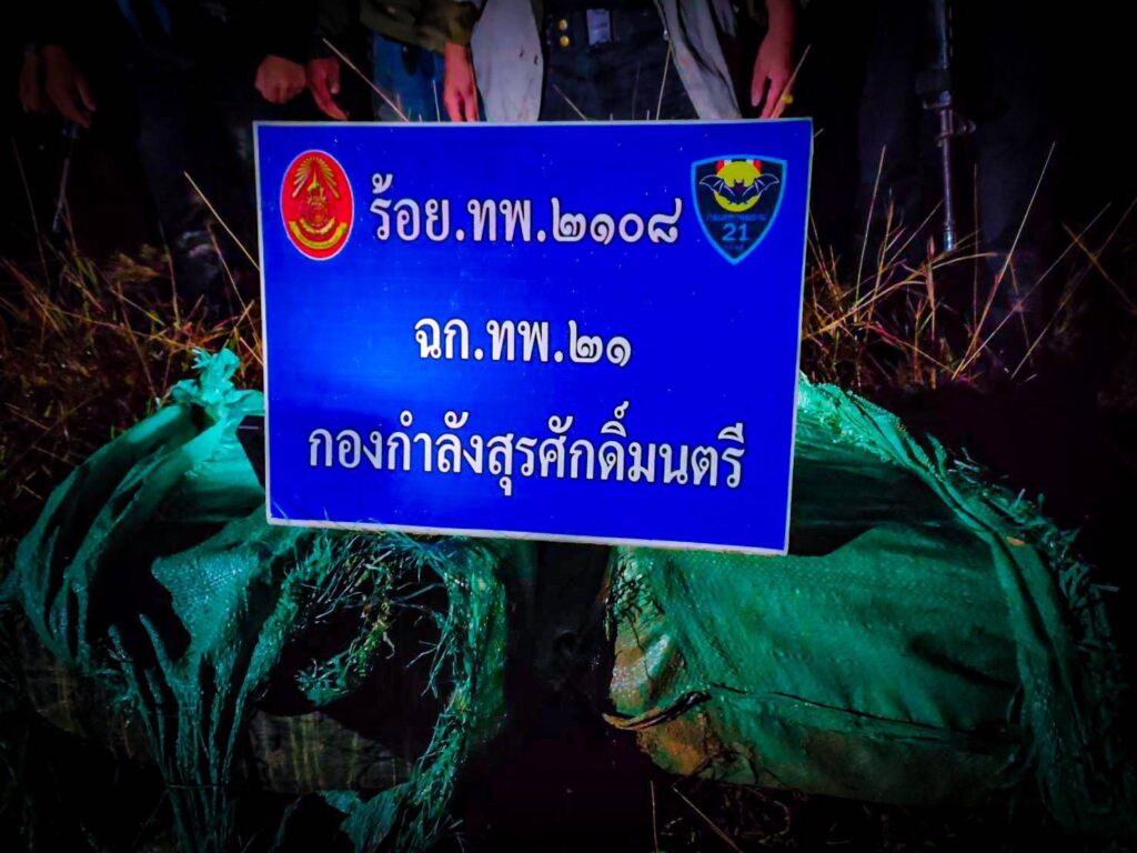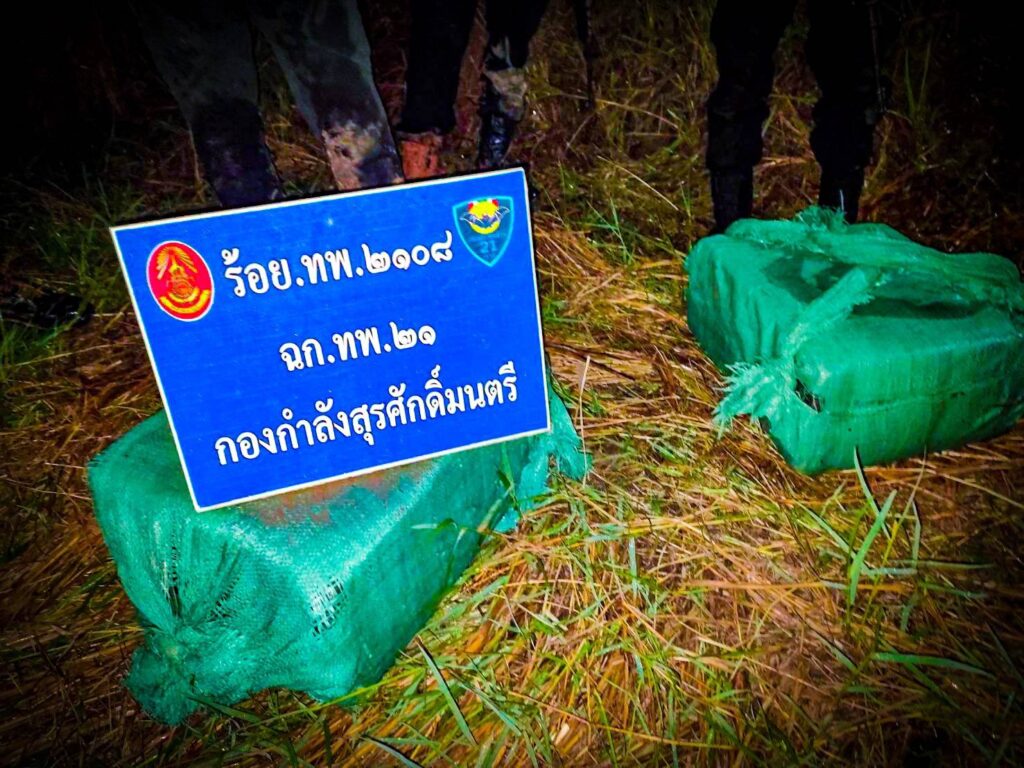 วันที่ 21 ก.พ.65 กองกำลังสุรศักดิ์มนตรี โดย ร้อยตรี วันชาติ เหมือนปืน ผู้บังคับกองร้อยทหารพรานที่ 2108 หน่วยเฉพาะกิจกรมทหารพรานที่ 21 เปิดเผยว่า เมื่อดึกคืนที่ผ่านมาไได้รับแจ้งจากแหล่งข่าวในพื้นที่ว่าจะมีการลักลอบขนย้ายยาเสพติดจากประเทศเพื่อนบ้านเข้ามาในพื้นที่รับผิดชอบของหน่วยบริเวณ บ.ม่วงชี ต.โพนทอง อ.บ้านแพง จ.นครพนม เพื่อลำเลียงส่งต่อไปยังพื้นที่ตอนใน จึงจัด ชุดปฏิบัติการเคลื่อนที่เร็วของหน่วย เข้าทำการซุ่มเฝ้าตรวจจุดเสี่ยง,จุดล่อแหลม พื้นที่สำคัญ ตามภาพข่าวที่ได้รับแจ้งจากแหล่งข่าว(ไม่ประสงค์ออกนาม) เพื่อป้องกันและสกัดกั้นขบวกการค้ายาเสพติดข้ามชาติ ครั้นเมื่อเวลาประมาณ 2120 น.ตรวจพบชายประมาณ 4 คน ไม่ทราบอายุและสัญชาติ เดินแบกสิ่งของมาตามป่า ตามทุ่งนา มุ่งหน้ามายังถนนหลวงหมายเลข 212 จึงแสดงตัวขอตรวจค้น เเต่กลุ่มชายดังกล่าวได้ทำการขัดขืนไม่ยอมให้ตรวจค้น โดยได้ทิ้งสิ่งของที่ลำเลียงมาและวิ่งหลบหนี กำลังพลของหน่วยจึงได้ทำการวิ่งไล่ติดตาม และยิงปืนขึ้นฟ้า เพื่อให้กลุ่มขบวนการค้ายาเสพติดข้ามชาติหยุดวิ่งในการหลบหนี แต่กลุ่มชายดังกล่าวไม่ยอมหยุดวิ่ง แล้วอาศัยความชำนาญในพื้นที่หลบหนีไปกับความมืด บริเวณทุ่งนา บ.ม่วงชี ม.4 ต.โพนทอง อ.บ้านแพง จ.นครพนม จึงทำการตรวจสอบพื้นที่โดยรอบพบถุงกระสอบต้องสงสัย จำนวน 4 กระสอบ เมื่อตรวจสอบเบื้องต้นภายในกระสอบ พบเป็นยาเสพติดประเภท 5 (กัญชา) ทั้ง 4 กระสอบ จำนวน 100 แท่ง/กก. จึงได้ทำการขนย้ายมาที่ บก.ร้อย.ทพ.2108 และประสานหน่วยงานความมั่นคงในพื้นที่ ร่วมบูรณาการตรวจยึดของกลางดังกล่าวพรัอมนำยาเสพติดทั้งหมดส่ง พนักงานสอบสวน สภ.บ้านแพง จ.นครพนม เพื่อดำเนินคดีตามกฎหมายต่อไป