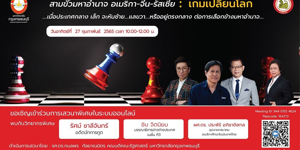 นักศึกษาหลักสูตรรัฐประศาสนศาสตรดุษฎีบัณฑิต (DPA14) คณะรัฐศาสตร์ มหาวิทยาลัยกรงเทพธนบุรี จัดเสวนาในหัวข้อ “สามขั้วมหาอำนาจ อเมริกา-จีน-รัสเซีย : เกมเปลี่ยนโลก” โดยมีวิทยากรผู้ร่วมเสวนา : คุณชิบ จิตนิยม บรรณาธิการข่าวต่างประเทศ เนชั่น ทีวี,คุณรัศม์ ชาลีจันทร์ อดีตนักการทูต,ผศ.ดร.ประพีร์ อภิชาติสกล อาจารย์ประจำภาควิชารัฐศาสตร์ มหาวิทยาลัยศรีนครินทรวิโรฒ และอุปนายกสมาคมอเมริกาศึกษาในประเทศไทย ดำเนินรายการโดย รศ.ดร.กมลพร กัลยาณมิตร คณบดีคณะรัฐศาสตร์ มหาวิทยาลัยกรุงเทพธนบุรี สนใจสามารถเข้าฟังได้ในระบบ ZOOM