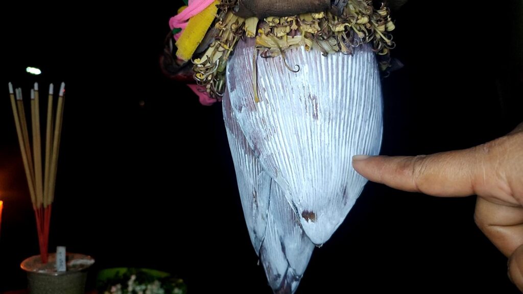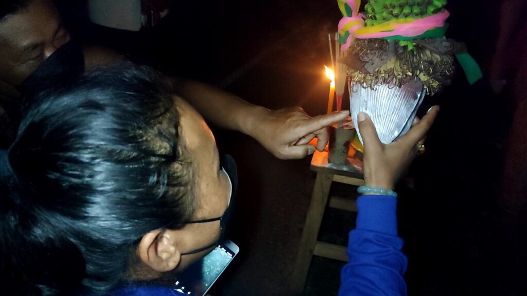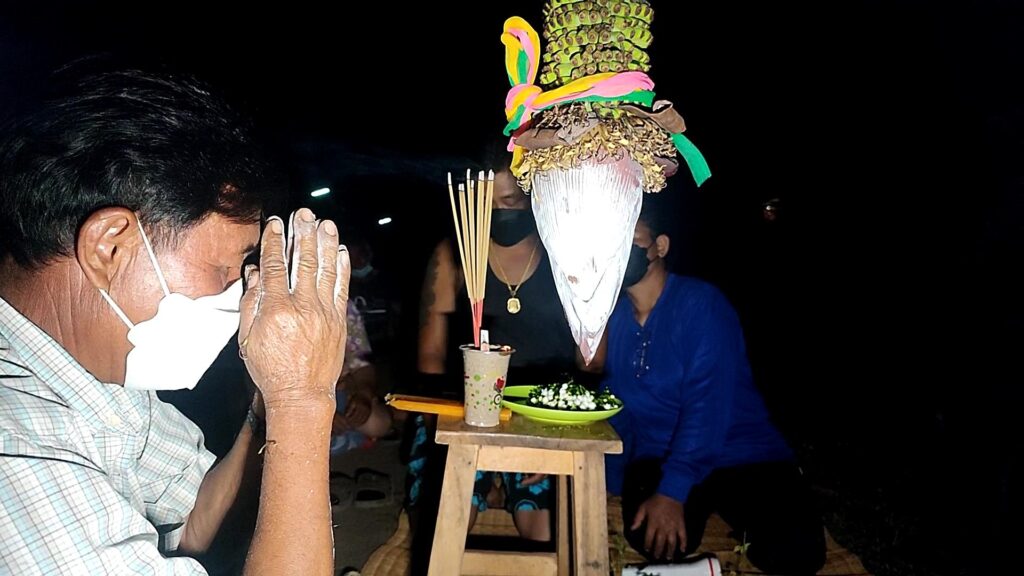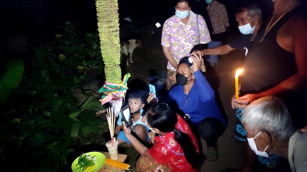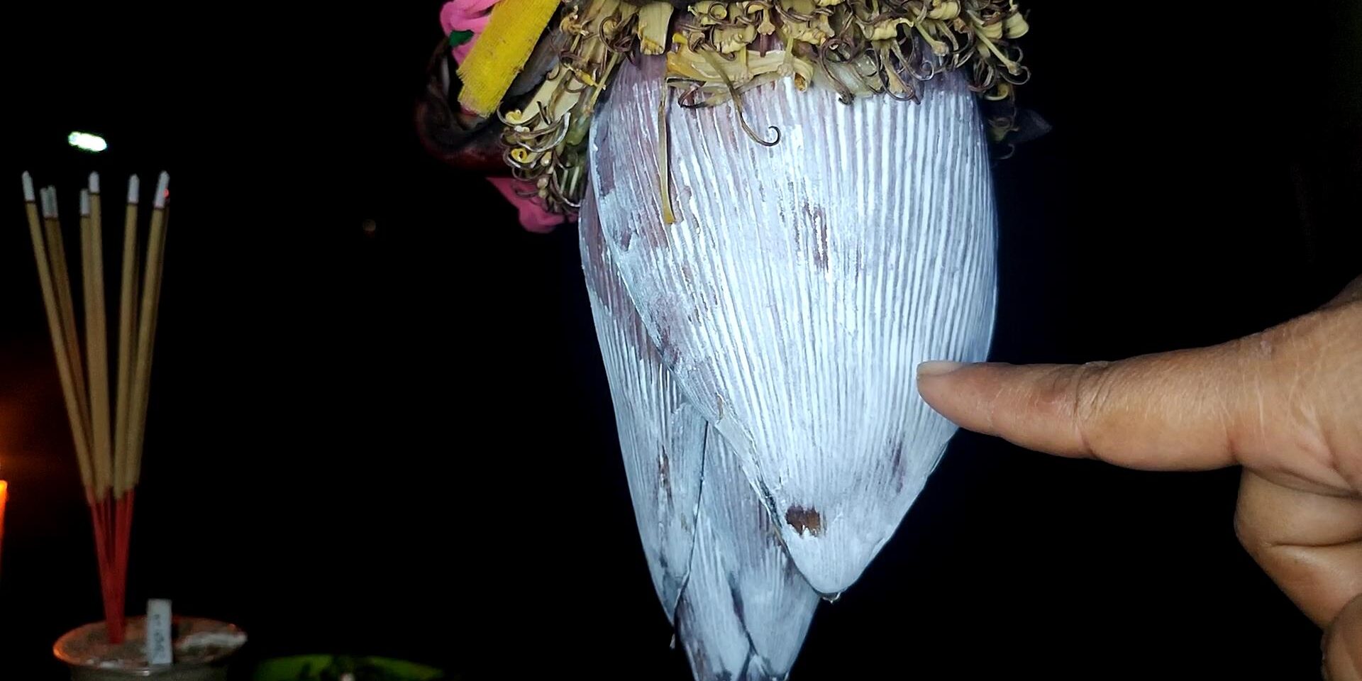 จึงเดินทางไปตรวจสอบ พบชาวบ้านนับสิบคน ต่างกำลังพากัน นำดอกไม้ธูปเทียน แต่งขันธ์ 5 มาทำพิธีเซ่นไหว้ ขอโชคลาภ และขอเลขเด็ดจากเครือกล้วย จากนั้นได้นำแป้งฝุ่น มาลูบไปที่หัวปลีจนทั่ว แล้วใช้เทียนและแสงไฟ ส่องไปที่หัวปลี เพ่งหาตัวเลข บางคนก็ใช้โทรศัพท์มือถือ เปิดกล้องถ่ายรูปและส่องหาตัวเลข ซึ่งก็ไม่ผิดหวัง ต่างมองเห็นเลขเด็ด ปรากฎขึ้นเด่นชัดบนหัวปลี ได้เลข 174 และนอกจากนี้ ก็ยังมีเลขธูปเสี่ยงทาย ที่จุดไปพร้อมกัน เป็นเลข 158 จึงเตรียมนำเลขที่ได้ ไปเสี่ยงโชค เสี่ยงดวงตามความเชื่อ ในช่วงโค้งสุดท้ายก่อนหวยออก ต่อไป