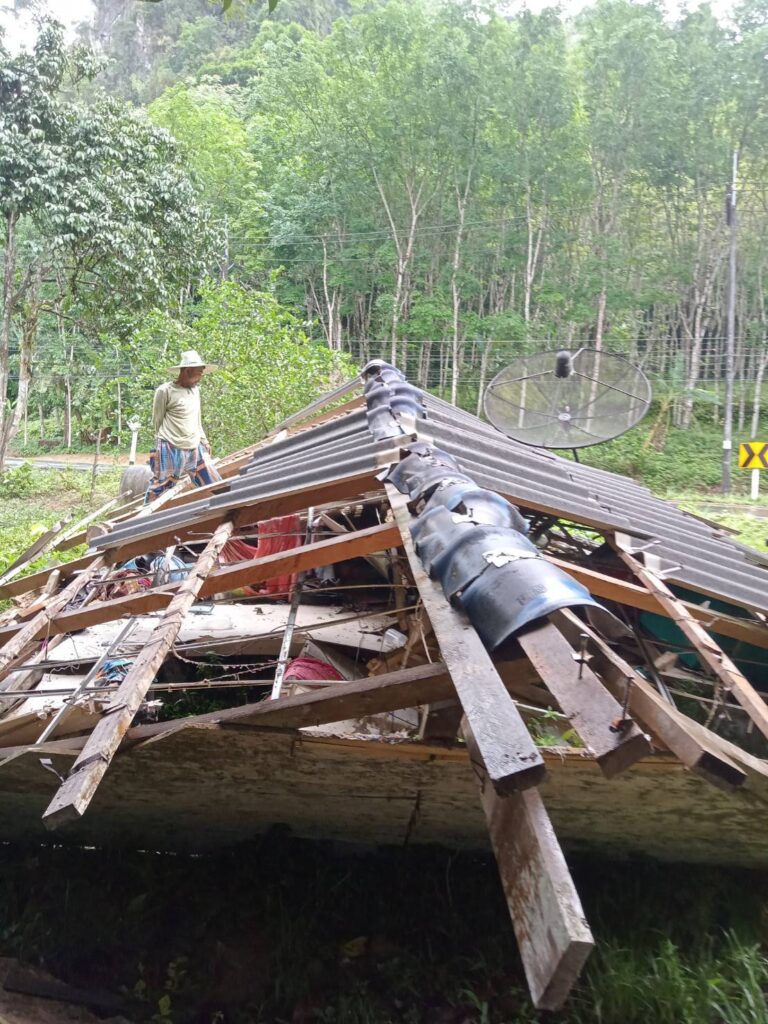 โดยหลังแรกเป็นบ้านของนางสุรภา ชัยโรจน์ บ้านเลขที่ 183 ที่หมู่ที่ 3 บ้านควนล่อน ตำบลควนกาหลง ซึ่งบ้านเรือนได้รับความเสียหายหลังจากพายุฝนพัดหลังคาบ้านเรือนหลุดออกจากตัวบ้าน เมื่อวันที่ 27 กุมภาพันธ์ 2565 ส่งผลให้หลังคาบริเวณชั้น 2 ของตัวบ้านได้รับความเสียหาย ส่วนบ้านหลังที่ 2 ร้านอาหารตามสั่งป้าแดง บ้านเลขที่ 157 หมู่ที่ 3 บ้านควนล่อน ซึ่งอยู่ห่างจากบ้านหลังแรกประมาณ 150 เมตร ได้รับความเสียหายจากพายุฝนพัดหลังคาสังกะสีหลุดออกจากบ้านเช่นกัน โดยองค์การบริหารส่วนตำบลควนกาหลง ได้มอบหลังคากระเบื้องและเงินเพื่อเป็นการช่วยเหลือเบื้องต้นให้แก่เจ้าของบ้านทั้ง 2 หลังแล้ว ในโอกาสนี้ผู้ว่าราชการจังหวัดสตูล และนายกเหล่ากาชาดจังหวัดสตูล ร่วมมอบสิ่งของอุปโภค บริโภค หน้ากากอนามัย และเจลแอลกอฮอล์ พร้อมเงินช่วยเหลือให้แก่เจ้าของบ้านทั้ง 2 หลัง และสำนักงานพัฒนาสังคมและความมั่นคงของมนุษย์จังหวัดสตูล ร่วมมอบเงินช่วยเหลือเช่นกัน