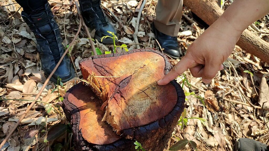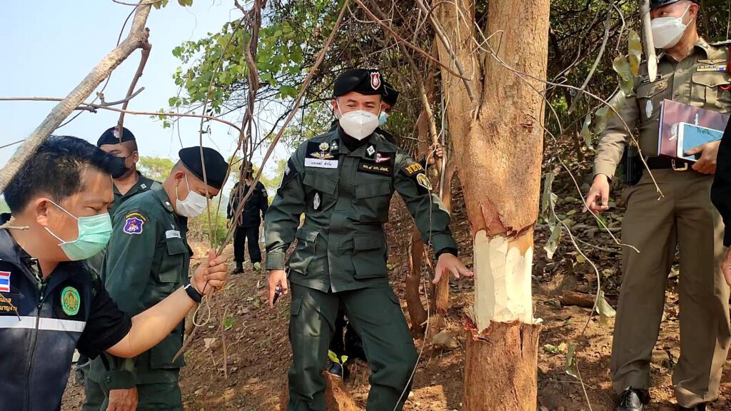 เมื่อเข้าไปถึงบริเวณตามที่ได้รับแจ้ง พิกัดจากเครื่องตรวจวัดสัญญาณดาวเทียมทางภูมิศาสตร์ (GPS)ระบบ WGS84 พิกัดที่ 47Q 640717 E UTM 181757ด N เจ้าหน้าที่พบว่า มีการบุกรุกแผ้วถางป่าจริง ลักษณะเป็นการบุกรุกแผ้วถางป่าใหม่ ต้นไม้น้อยใหญ่ถูกตัดฟันกระจายรอบแปลงที่ถูกบุกรุก บางต้นมีลักษณะถูกตัดด้วยเลื่อยโซ่ยนต์ บางต้นถูกตัดด้วยของมีคมเต็มพื้นที่บริเวณที่ถูกบุกรุกแผ่วถาง และต้นไม้ใหญ่ที่มีคุณค่าทางธรรมชาติและทางเศรษฐกิจที่ยืนต้นอยู่ ถูกกานด้วยของมีคม เพื่อให้ต้นไม้ยืนต้นตายและจะได้ง่ายต่อการทำลายต้นไม้ดังกล่าว โดยไม่มีความเกรงกลัวต่อกฎหมายและไม่คำนึงถึงผลเสียหายที่จะก่อให้เกิดแก่ระบบนิเวศทางธรรมชาติต่อส่วนรวม