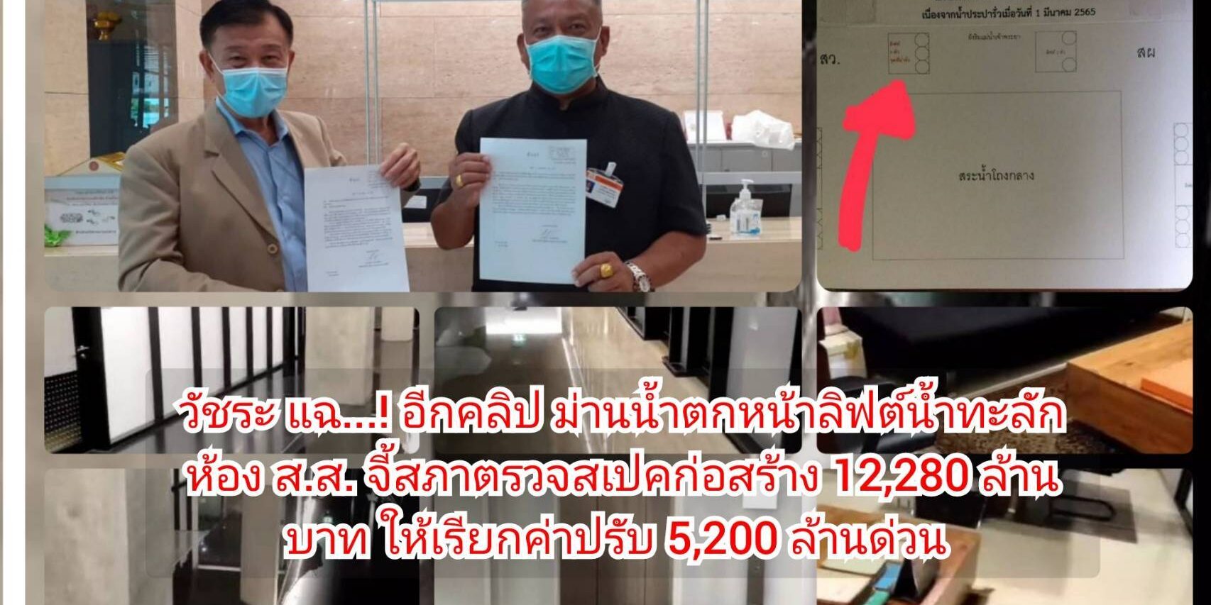 ผมได้รับคลิปน้ำประปารั่วท่วมสภาฯ ในวันที่ 1 มีนาคมที่ผ่านมาอีก 1 คลิป จะเห็นว่ามวลน้ำไหลทะลักลงตามช่องลิฟต์จากชั้น 8 ลงถึงชั้นบี 1 ที่หน้าลิฟต์ชั้น 6 เกิดม่านน้ำตกสวยงามไหลเป็นม่านตกลงบริเวณหน้าลิฟต์ทั้ง 3 ตัวแล้วไหลเจิ่งนองรอการระบายไปตามทางเดินเข้าไปในห้องทำงานของท่านส.ส.ผู้ทรงเกียรติจนพรมเปียก แต่โชคดีที่สภาปิดสมัยประชุมไปแล้ว