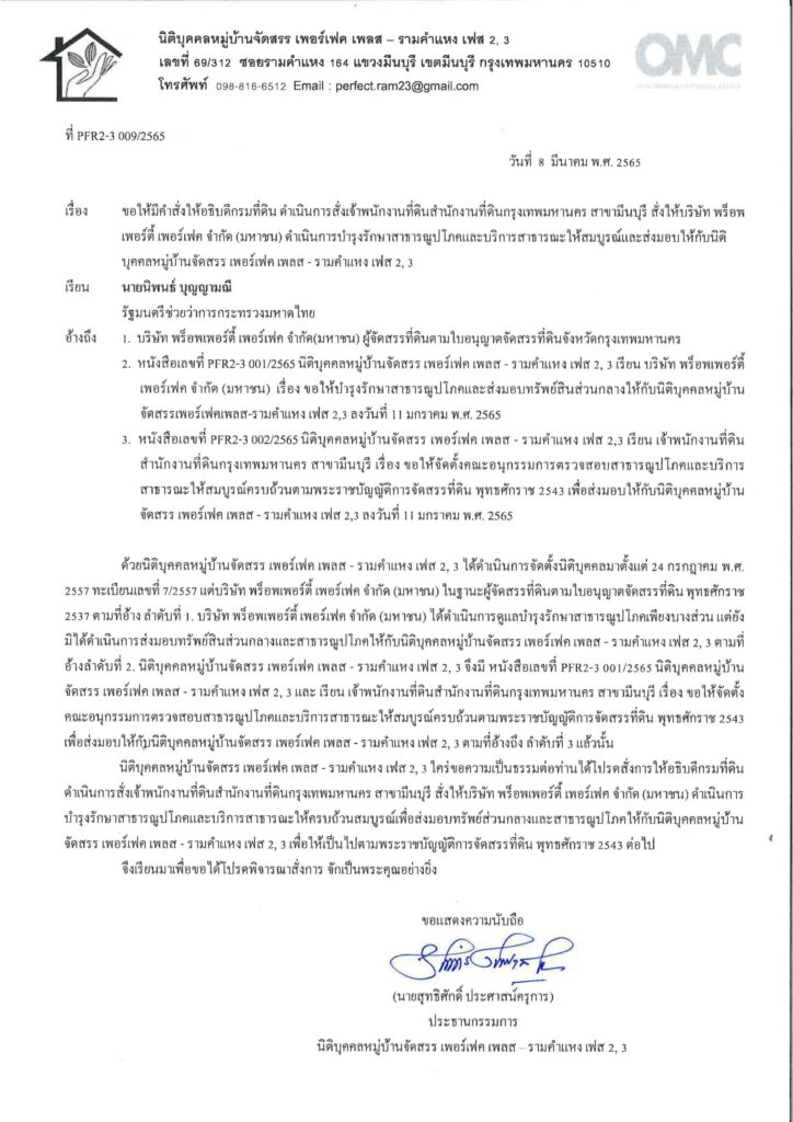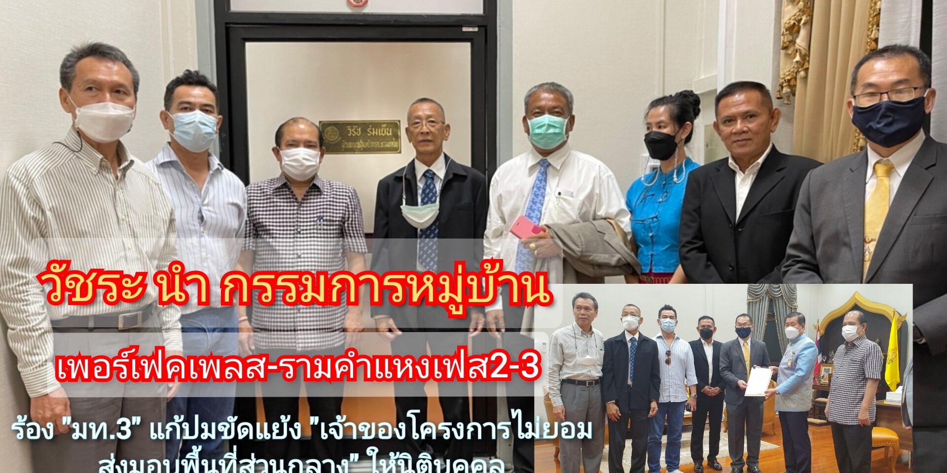 ในฐานะผู้จัดสรรที่ดินตามใบอนุญาตจัดสรรที่ดิน พ.ศ.2537 ได้ดำเนินการดูแลบำรุงรักษาสาธารณูปโภคเพียงบางส่วน ยังมิได้ส่งมอบทรัพย์สินส่วนกลางและสาธารณูปโภคให้กับนิติบุคคลหมู่บ้านจัดสรร เพอร์เฟค เพลส – รามคำแหง เฟส 2, 3 จึงได้มีหนังสือถึงเจ้าพนักงานที่ดินสำนักงานที่ดินกรุงเทพมหานคร สาขามีนบุรี ขอให้จัดตั้งคณะอนุกรรมการ ตรวจสอบสาธารณูปโภคและบริการสาธารณะให้สมบูรณ์ครบถ้วนตามพระราชบัญญัติการจัดสรรที่ดิน พุทธศักราช 2543 เพื่อส่งมอบให้กับนิติบุคคลหมู่บ้านจัดสรร เพอร์เฟค เพลส – รามคำแหง เฟส 2, 3 ลงวันที่ 11 ม.ค. 65 แล้ว แต่ยังไม่มีความคืบหน้าใดๆ จึงร้องเรียนต่อนายวัชระ และนายวัชระ จึงได้นำเรื่องนี้ร้องเรียนต่อรมช.มหาดไทยในวันนี้