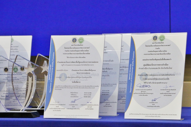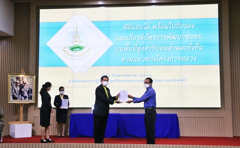 นายจรัลธาดา กรรณสูต องคมนตรี ประธานกรรมการมูลนิธิโครงการหลวง และ พลเอก กัมปนาท รุดดิษฐ์ องคมนตรี ประธานกรรรมการบริหารมูลนิธิโครงการหลวง ให้เกียรติเป็นประธานในพิธีมอบโล่พร้อมใบรับรอง และเกียรติบัตร โครงการพัฒนาชุมชนบนพื้นที่สูงคาร์บอนต่ำและยั่งยืนตามแนวทางโครงการหลวง ให้กับผู้นำชุมชนในพื้นที่มูลนิธิโครงการหลวง 9 แห่ง และผู้นำชุมชนในพื้นที่โครงการพัฒนาพื้นที่สูงแบบโครงการหลวง 8 แห่ง รวมทั้งสิ้น 17 แห่ง โดยได้รับการรับรองมาตรฐานจาก ศูนย์วิจัยตรวจประเมินและให้การรับรองมาตรฐานการจัดการสิ่งแวดล้อม คณะสิ่งแวดล้อมและทรัพยากรศาสตร์ มหาวิทยาลัยมหิดล ณ ห้องประชุมอาคารปฏิบัติการ 1 ศูนย์วิจัยและพัฒนาการเกษตรโครงการหลวง ชนกาธิเบศรดำริ ตำบลแม่เหียะ อำเภอเมือง จังหวัดเชียงใหม่