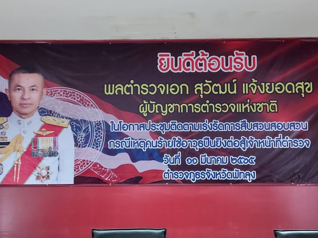 วันที่ 11 มี.ค.65 เวลา 10.30 น.ณ ห้องประชุม ภ.จ.พัทลุง : พล.ต.อ.สุวัฒน์ แจ้งยอดสุข ผบ.ตร.พร้อมด้วยคณะ ได้เดินทางมาตรวจเยี่ยม และประชุมติดตามเร่งรัดการสืบสวนสอบสวน กรณีเหตุคนร้ายใช้อาวุธปืนยิงต่อสู้เจ้าหน้าที่ตำรวจ เมื่อวันที่ 10 มีนาคม 2565 บริเวณแยกเข้าเขาชัยสน (แยกท่านางพรหม) หมู่ที่ 6 ต.โคกม่วง อ.เขาชัยสน จ.พัทลุง