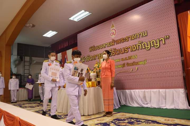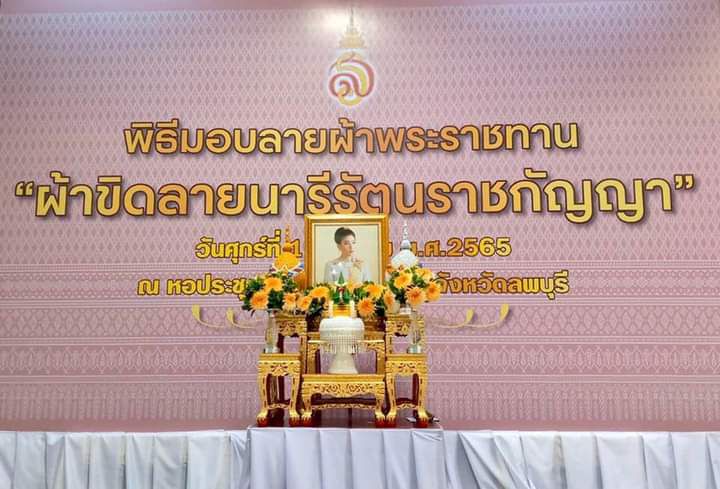 วันศุกร์ที่ 11 มีนาคม 2565 เวลา 08.30 น. ณ หอประชุมอำเภอเมืองลพบุรี นายนิวัฒน์ รุ่งสาคร ผู้ว่าราชการจังหวัดลพบุรี พร้อมด้วยนางวัชราภรณ์ รุ่งสาคร ประธานแม่บ้านมหาดไทยจังหวัดลพบุรี เป็นประธานในพิธีมอบแบบลายผ้าขิดพระราชทาน “ผ้าขิดลายนารีรัตนราชกัญญา” เบื้องหน้าพระรูปสมเด็จพระเจ้าลูกเธอเจ้าฟ้าสิริวัณณวรีนารีรัตนราชกัญญา ให้แก่นายอำเภอและนายกกิ่งกาชาดอำเภอ จำนวน 11 อำเภอของจังหวัดลพบุรี และผู้ผลิตผ้าจำนวน 14 กลุ่ม ได้แก่ กลุ่มแสงจันทร์ผ้ามัดหมี่, กลุ่มสตรีอาสาบ้านพวน, กลุ่มบาติกน้ำเต้าหู้, กลุ่มปราณี ต้นเทียน, กลุ่มแม่บ้านเกษตรกรตำบลหินปัก, กลุ่มสตรีสหกรณ์มหาโพธิ, ศูนย์ศิลปิน OTOP จังหวัดลพบุรี, ศูนย์พัฒนาภูมิปัญญาท้องถิ่น, กลุ่มทอผ้าบ้านร่วมใจสามัคคี หมู่ที่ 12, กลุ่มสตรีทอผ้าร่วมใจสามัคคี หมู่ที่ 5, กลุ่มวิสาหกิจชุมชนเย็บผ้าบ้านภูเขาทอง, กลุ่มทอผ้าบ้านชอนสมบูรณ์, กลุ่มสตรีทอผ้าบ้านหนองปล้อง, ร้านลี่แซแพรพรรณ เพื่อเป็นต้นแบบพัฒนาต่อยอดเพิ่มมูลค่าให้ผลิตภัณฑ์ผ้าพื้นถิ่นให้มีความทันสมัยสามารถก้าวสู่สากลเพื่อวิถีชุมชนที่ยังยืน