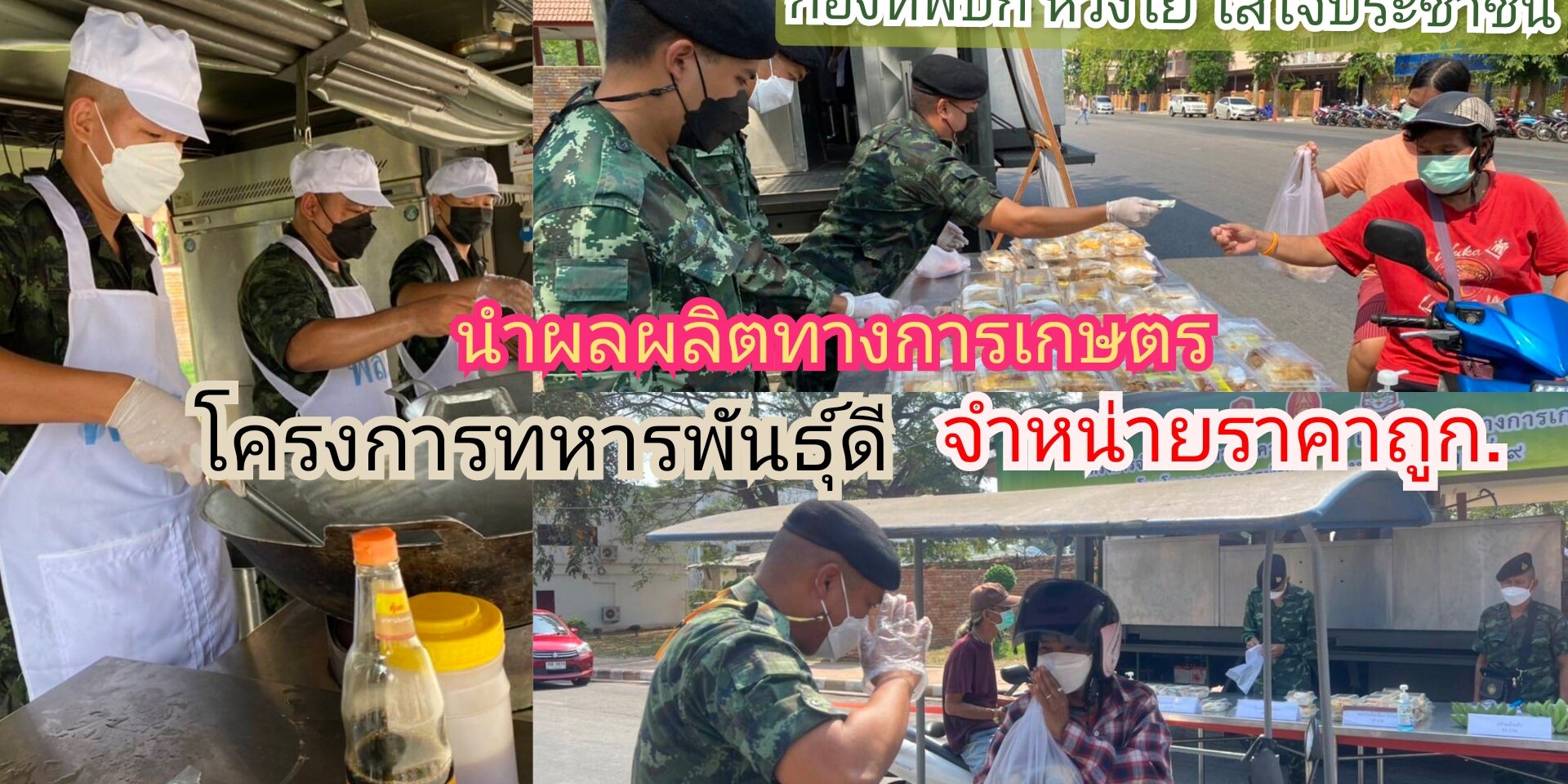 พร้อมทั้งได้นำกล้วยน้ำว้า หวีละ 15 บาท ซึ่งเป็นผลผลิตทางการเกษตรโครงการทหารพันธุ์ดีของหน่วย มาจำหน่ายให้กับประชาชนในราคาถูกกว่าท้องตลาด เพื่อเป็นการลดรายจ่ายให้กับพี่น้องประชาชน ซึ่งได้รับผลกระทบจากสภาวะเศรษฐกิจปัจจุบัน การปฏิบัติอยู่ภายใต้มาตราการ การป้องกันการแพร่ระบาดของโรคโควิด-19 อย่างเคร่งครัด. ณ.ศาลาขุนแผน หน้าเมืองกาญจนบุรี. อ.เมือง ต.บ้านใต้ จ.กาญจนบุรี