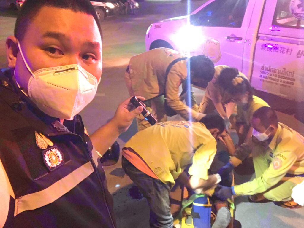 รายที่ 2 มีอาการ กระดูกต้นขาขวาหักผิดรูป หัวเข่าด้านขวา ถลอกเล็กน้อย สอบถามประเมินอาการเบื้องต้นเพื่อส่งต่อข้อมูลให้กู้ชีพ กู้ภัย