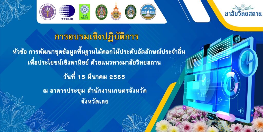 เชิงปฏิบัติการ ถ่ายทอดความรู้การพัฒนาชุดข้อมูลพื้นฐานไม้ดอกไม้ประดับอัตลักษณ์ประจำถิ่นเพื่อประโยชน์เชิงพาณิชย์ ด้วยแนวทางมาลัยวิทยสถาน ให้แก่ผู้ประกอบการไม้ดอกไม้ประดับในจังหวัดเลย ณ สำนักงานเกษตรจังหวัดเลย โดยมี ดร.วิภารัตน์ ดีอ่อง ผู้อำนวยการสำนักงานการวิจัยแห่งชาติ (วช.) เป็นประธานเปิดการอบรม,ดร.อนันต์ พิริยะภัทรกิจ และคณะนักวิจัย จาก (วว.) เป็นวิทยากรถ่ายทอดความรู้จากงานวิจัยให้แก่ผู้เข้าอบรม