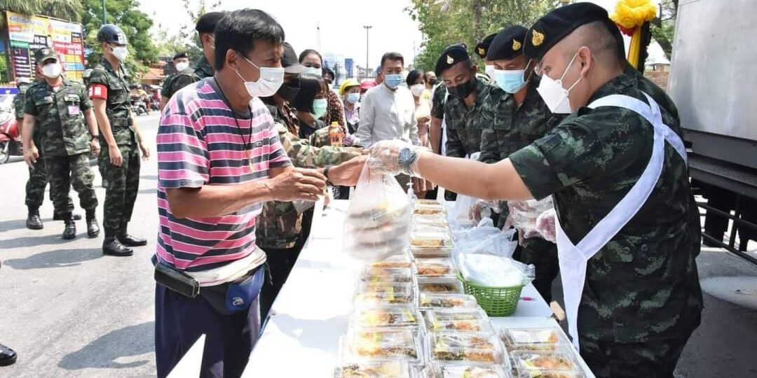 กองพลทหารราบที่ 9 จัดกิจกรรมแจกข้าวกล่องช่วยเหลือประชาชนใน “โครงการจำหน่ายอาหารราคาประหยัด และผลิตผลทางการเกษตร โดยโครงการทหารพันธุ์ดี กองพลทหารราบที่ 9” โดยมี พล.ต.บรรยง ทองน่วม ผู้บัญชาการกองพลทหารราบที่ 9 เป็นประธานในการจัดโครงการ พร้อมด้วยนายวสันต์ ภูษิตกาญจนา นายกเทศมนตรีเมืองกาญจนบุรี คณะผู้บริหาร หัวหน้าส่วนราชการ และเจ้าหน้าที่ทหารกองพันทหารปืนใหญ่ที่ 19 กรมทหารปืนใหญ่ที่ 9 ร่วมกันแจกจ่ายข้าวกล่องพร้อมทานให้กับประชาชน ซึ่งมาต่อแถวรับข้าวกล่องเป็นจำนวนมาก ภายใต้มาตราการป้องกันโควิด-19