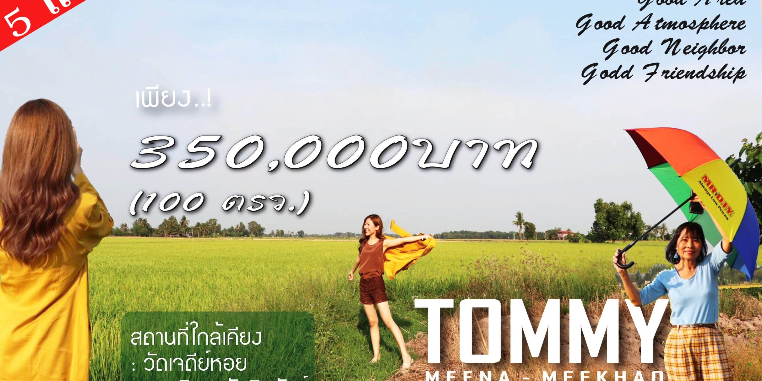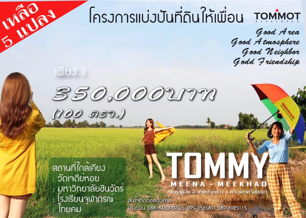 เมื่อเร็วๆนี้ บริษัท ทอมมอท จำกัด ได้เปิดโครงการ “ทอมมี่ มีนา มีข้าว” (แบ่งปันที่ดินให้เพื่อน) มีนายพสุวัชร์ มะโนนัย กรรมการผู้บริหาร และนายประทวน ประคุปตานนท์ เป็นผู้ควบคุมการก่อสร้างและดูแลโครงการ “ทอมมี่ มีนา มีข้าว” โดยได้รับเกียรติจาก ดร.ภาวัช รุจาฉันท์ รองคณบดีบัณทิตวิทยาลัย มหาวิทยาลัยเอเชีย อาคเนย์ ให้เกียรติมาเป็นประธานเปิดฯ ซึ่งโครงการ “ทอมมี่ มีนา มีข้าว” (แบ่งปันที่ดินให้เพื่อน) ตั้งอยู่ที่ตำบลคู้สลอด อำเภอลาดบัวหลวง จังหวัดพระนครศรีอยุธยา มีพื้นที่ทั้งหมด 11,200 ตารางเมตร (7 ไร่) แต่ทางบริษัท ทอมมอท จำกัด จะแบ่งจัดสรรให้เพื่อน ในพื้นที่ 100 ตารางวาจำนวน 12 แปลง (3 ไร่) ราคาเพียง 350,000 บาท และมีสถานที่ใกล้เคียง คือ วัดเจดีย์หอย,มหาวิทยาลัยชินวัตร,ไทยคม,โรงเรียนจุฬาภรณ์,ศูนย์ศิลปาชีพบางไทร และ สนามกอล์ฟบางไทร การคมนาคมสะดวกมาก