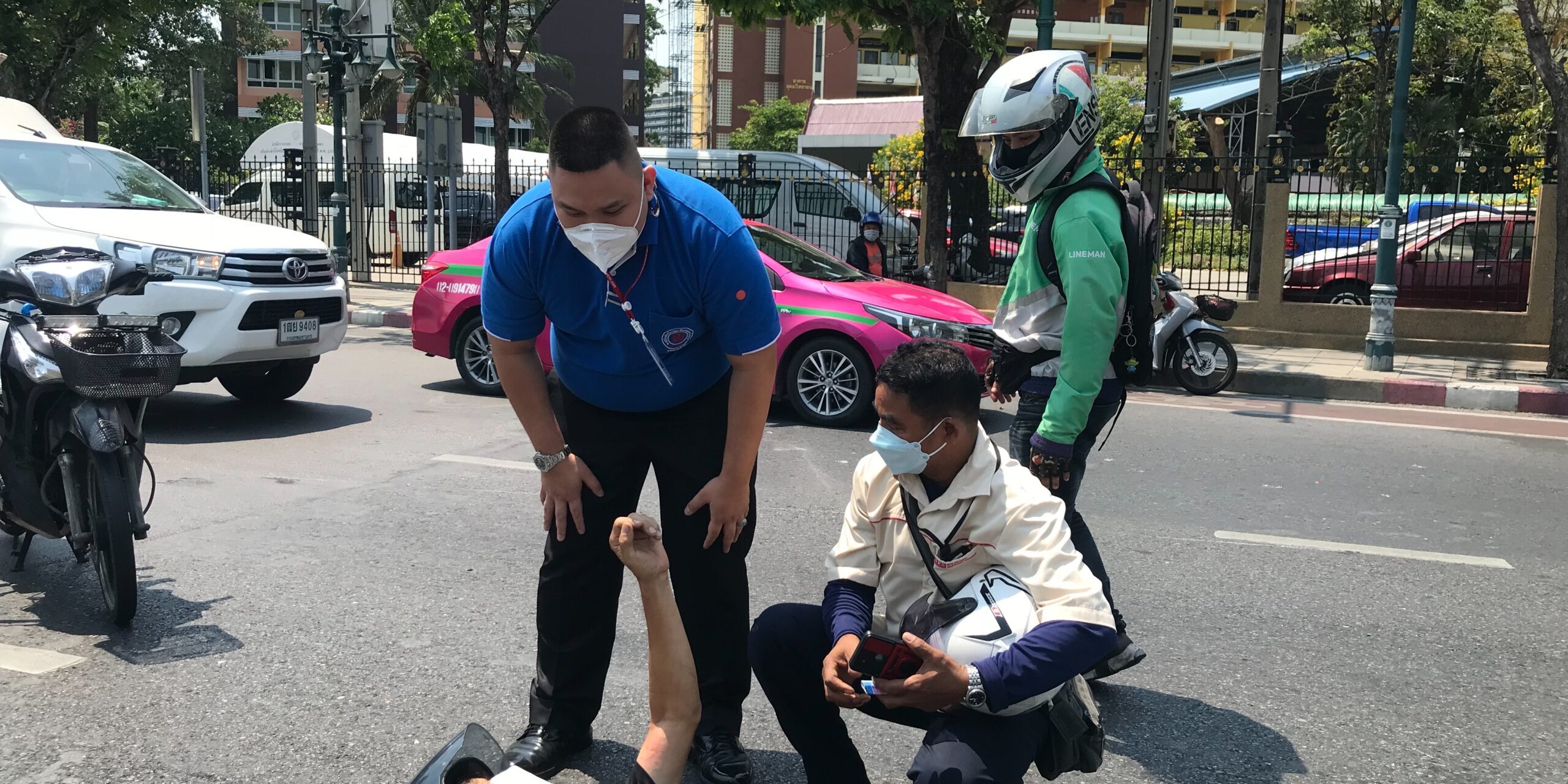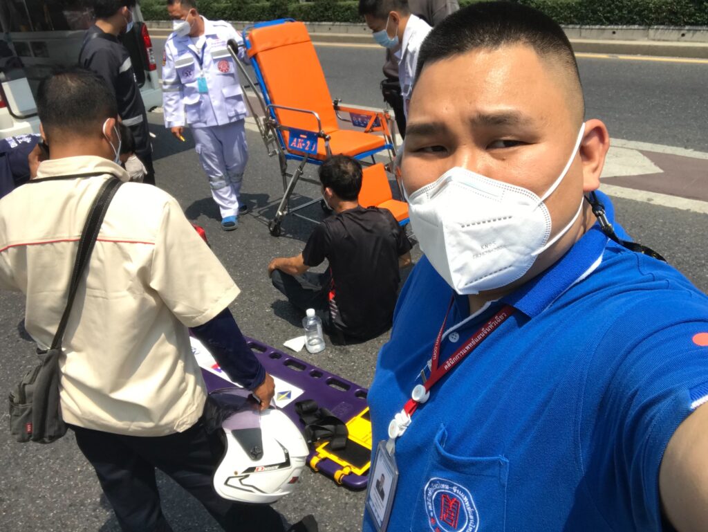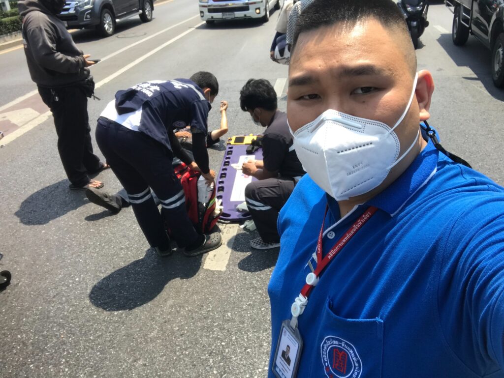 ระหว่างเดินทางในการปฏิบัติงานได้พบอุบัติเหตุรถจักรยานยนต์เฉี่ยวชนกันล้ม มีผู้ได้รับบาดเจ็บ 2 ราย คือผู้ขับขี่รถจักรยานยนต์คู่กรณีทั้ง 2 คัน บริเวณหน้าโรงเรียนศึกษานารี กรุงเทพฯ